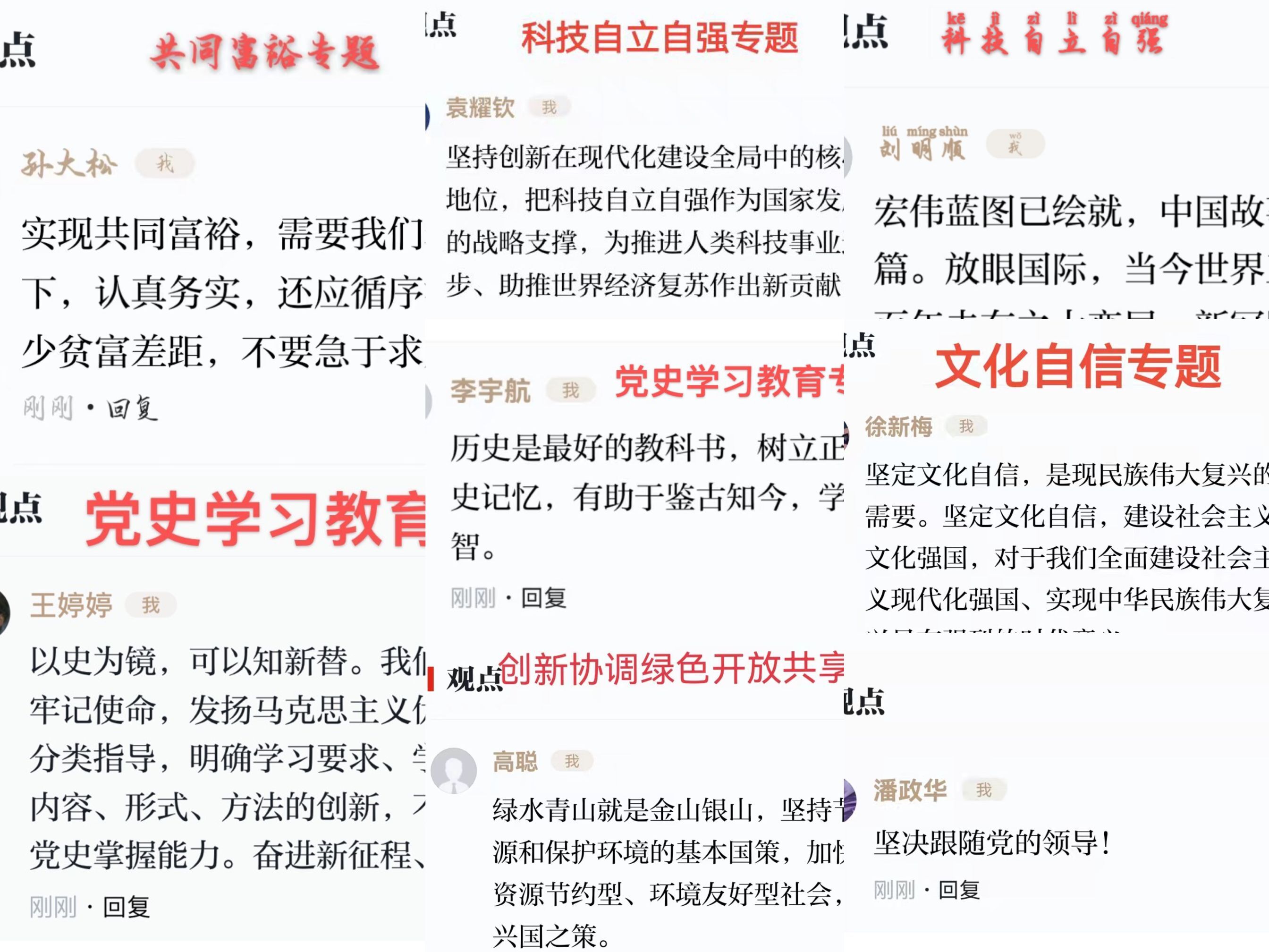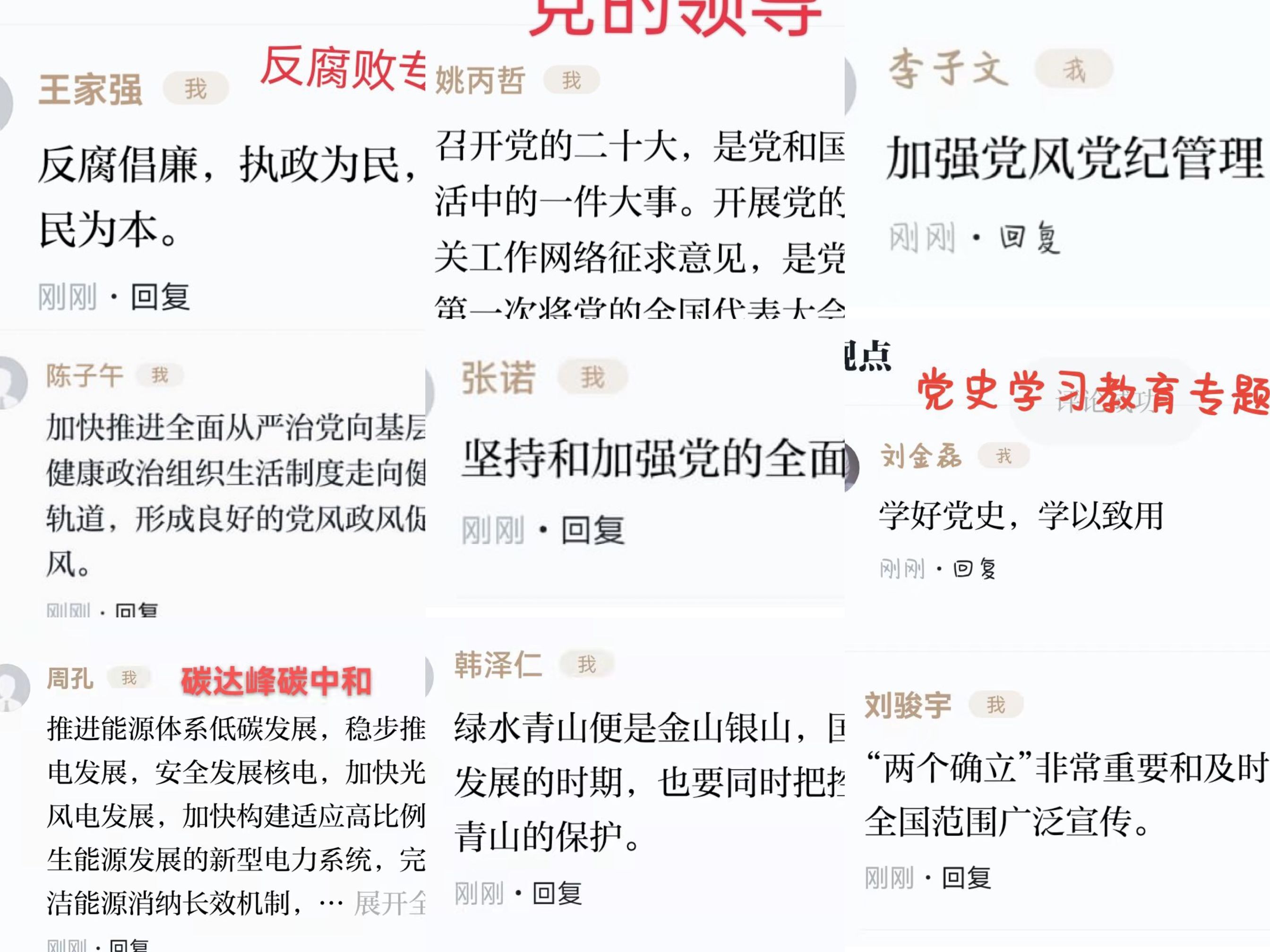 广开言路,人心所向。今年是中国共青团成立100周年,学习宣传党领导中国青年运动的光辉历程,团结引领广大青年坚定跟党走、建功新时代是对共青团成立100周年的最好庆祝。同学们通过参与学习强国平台推出的“建言”二十大、奋进新征程活动,选择关键词为二十大建言,坚持和加强党的全面领导,推进全面从严治党,把握新发展阶段,贯彻新发展理念,构建新发展格局,高聪同学认为:“新时代”就是向中华民族伟大复兴中国梦的实现中“百里半九十”的时代,一定要及时更新思想观念,甩掉包袱,以新形象展现新作为,动力更强劲,步伐更稳健。“建言”二十大,奋进新的征程。为实现第二个百年奋斗目标、实现中华民族伟大复兴的中国梦凝聚起强大青春力量。请党放心,强国有我,奋进红色征程,我们在行动!