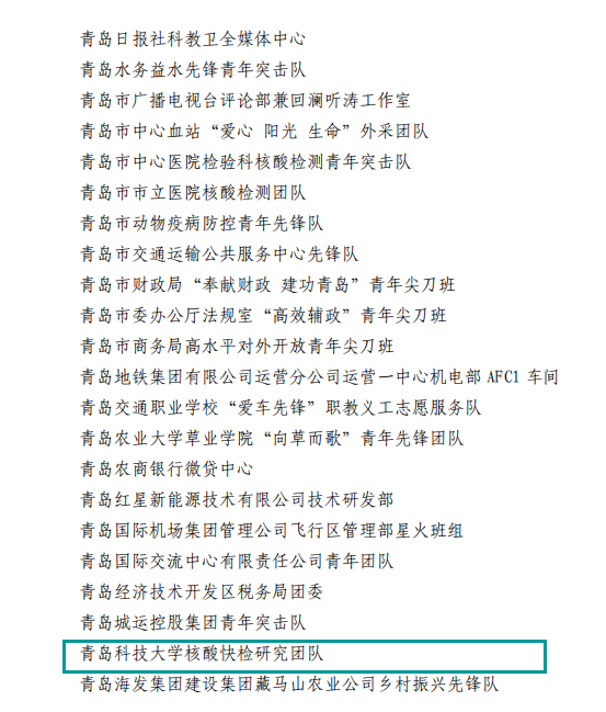 日前,共青团青岛市委、青岛市青年联合会、青岛市学生联合会联合通报表扬“青岛青年先锋团队”“青岛青年先锋”,我院马翠萍教授领衔的核酸快检研究团队获评“青岛青年先锋团队”,王硕教授获评“青岛青年先锋”。此次从青岛市各战线各领域评选出50支团队和50名个人,其中3所高校同时获评两项荣誉称号。