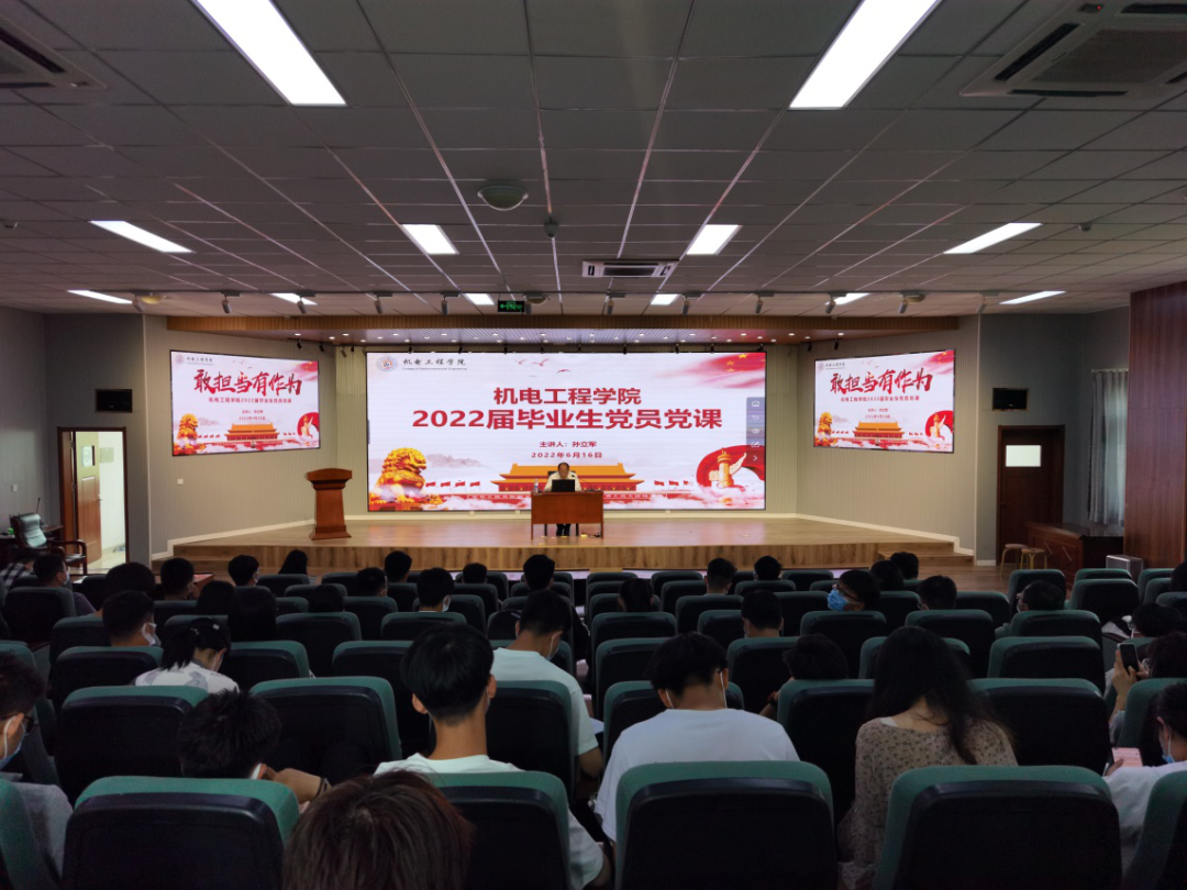 为加强对毕业生党员的教育管理,引导毕业生党员坚定理想信念,永葆党员先进性,迎接党的二十大胜利召开,机电工程学院开展“不忘初心使命,青春扬帆远航——2022届毕业生党员党课”活动。学院党委书记孙立军、毕业生辅导员以及学院全体毕业生党员同志参加本次党课。