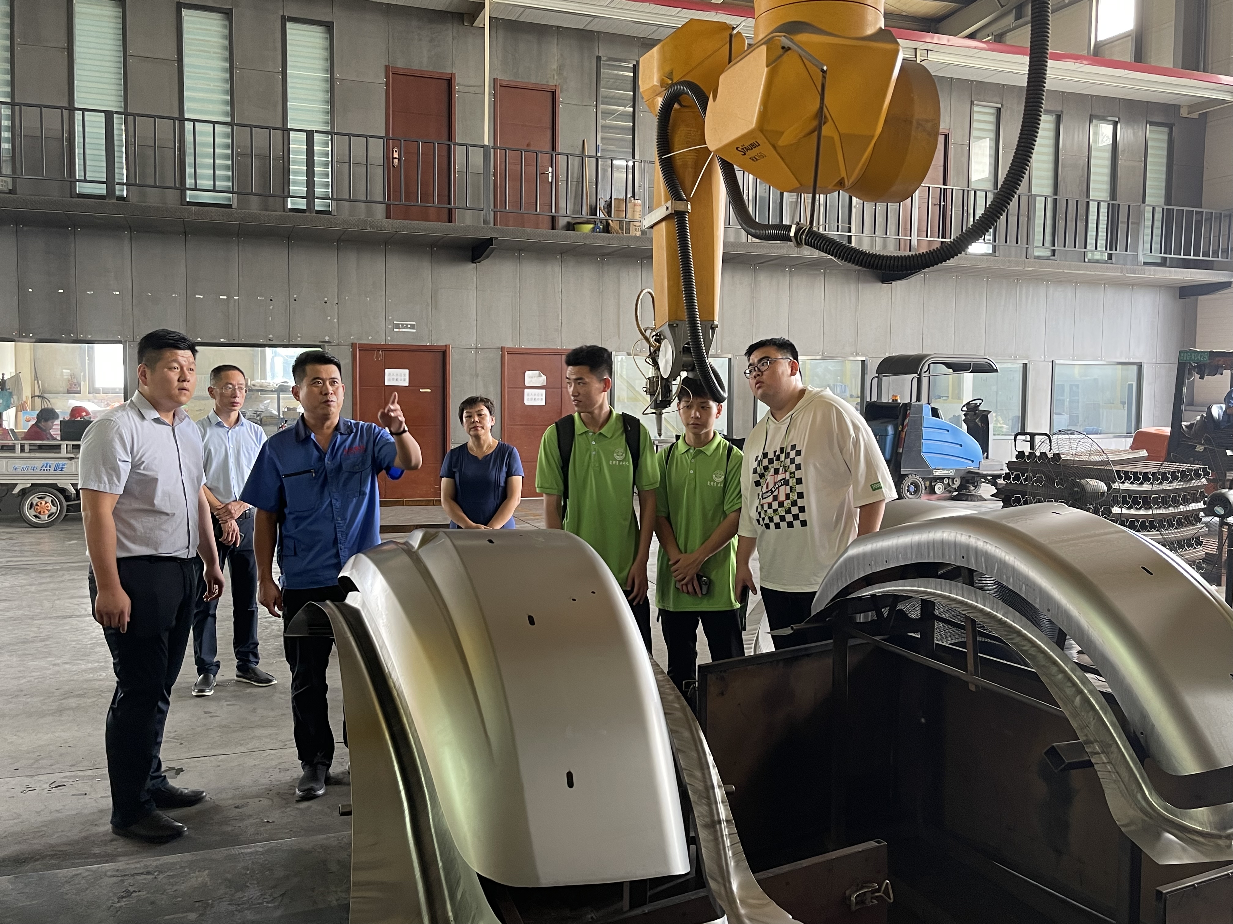 随后,实践团队一行在朱晓峰、孙金友的带领下深入厂区一线进行调研考察,参观了农业机械、工程机械、农机驾驶室等生产研发线及全自动涂装生产线。同时,走进新能源智能环卫车间,近距离、细致了解高端智能环卫车的设计制造、技术服务迭代输出,感受科技时代发展下企业新旧动能转换步伐。在交流中获悉,中远重科有限公司秉持“绿水青山就是金山银山”的绿色发展理念,不断提升产品的核心竞争力,以打造“中国智造”为己任,深化创新产业驱动、加快企业两化融合及国际化战略步伐,力求更多用户爱上“中国智造”。