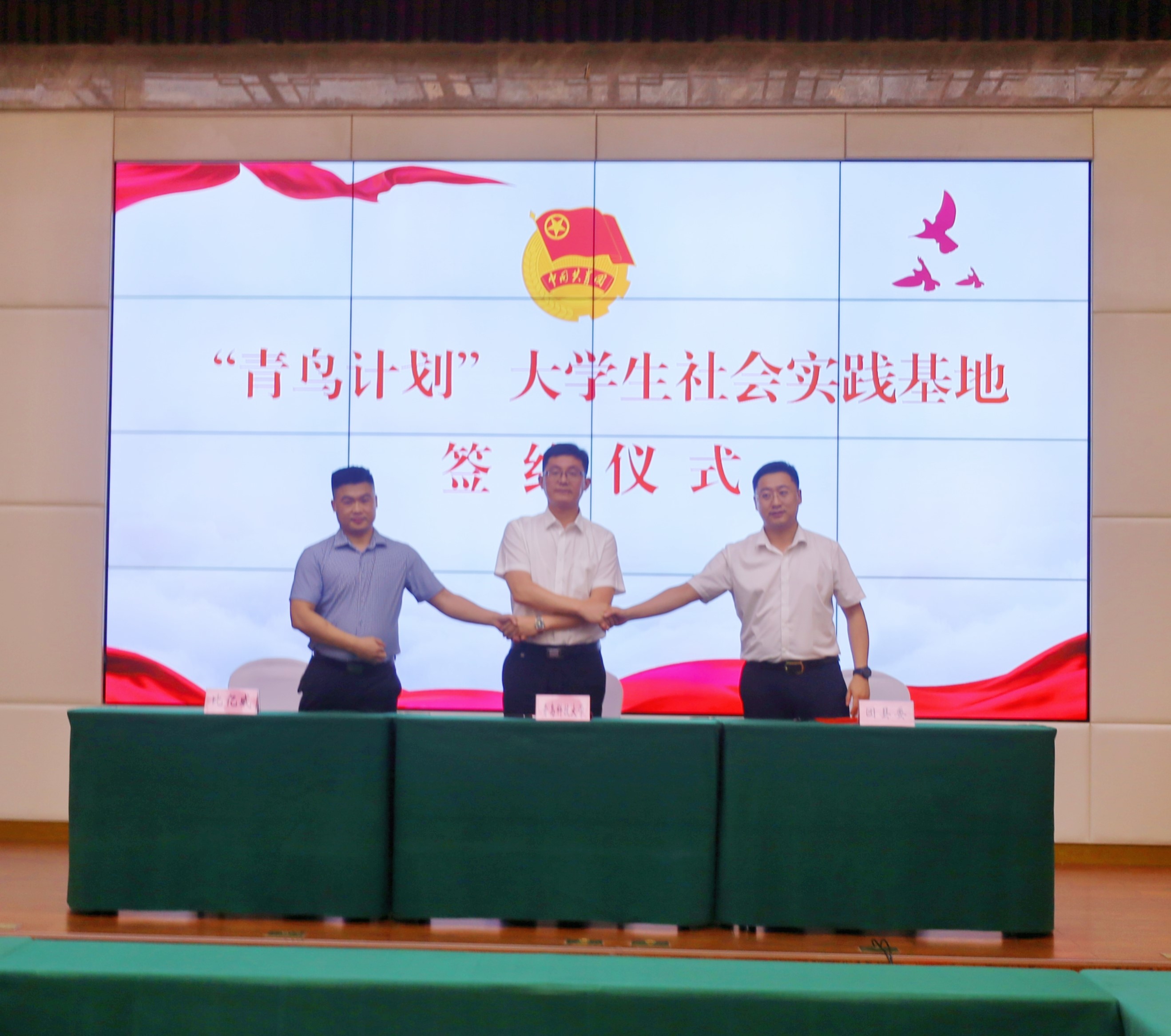 校团委书记毛常明、嘉祥县团委书记李永屹与山东比亿威科技有限公司总经理田文泰三方共同签订《校地企三方共建“青鸟计划”大学生社会实践基地协议》。