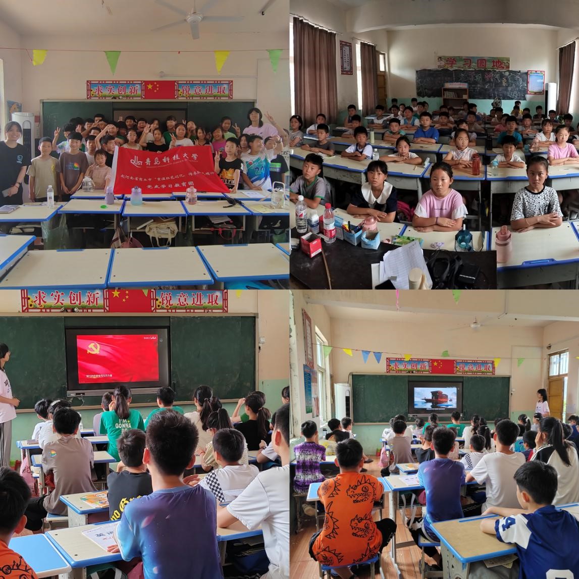 首先,乡村实践团成员们和孩子们在教室内开展党史学习教育课。团队成员分别为孩子们讲述了关于党从创立之初到取得伟大历史成就的艰辛历程,生动形象地展现了红色精神的魅力。着重介绍为和平发展做出重大牺牲的英雄事迹,孩子们全神贯注从讲述中汲取红色知识,一双双明亮的眼睛透露出对前辈们的敬仰和向往。此次课程着力培养孩子们的爱国爱党精神,并让孩子们充分体会当今安宁和平生活的来之不易。