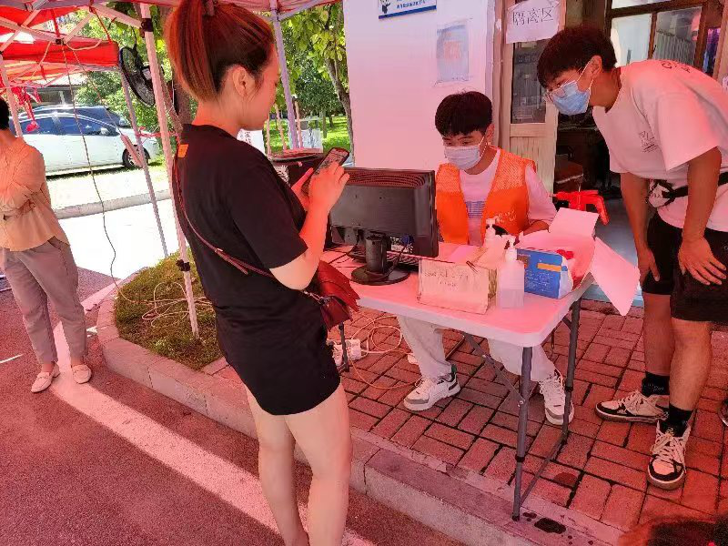 青春有责,向难而行。“请戴好口罩,配合测量体温……”一句句温馨的提示,一次次贴心的服务,志愿者们用自己的行动温暖着社区人民,用轻柔的话语劝说着未正确佩戴口罩的老人与小孩,开展文明引导。志愿者们在没有空调与风扇的社区服务点上任劳任怨,提醒居民们保持一米间距排队,带领大家高效迅速的完成核酸检测。他们身着红马甲,分工明确,各司其职,为核酸检测的安全提供有力保障,为防疫工作注入了青春力量。