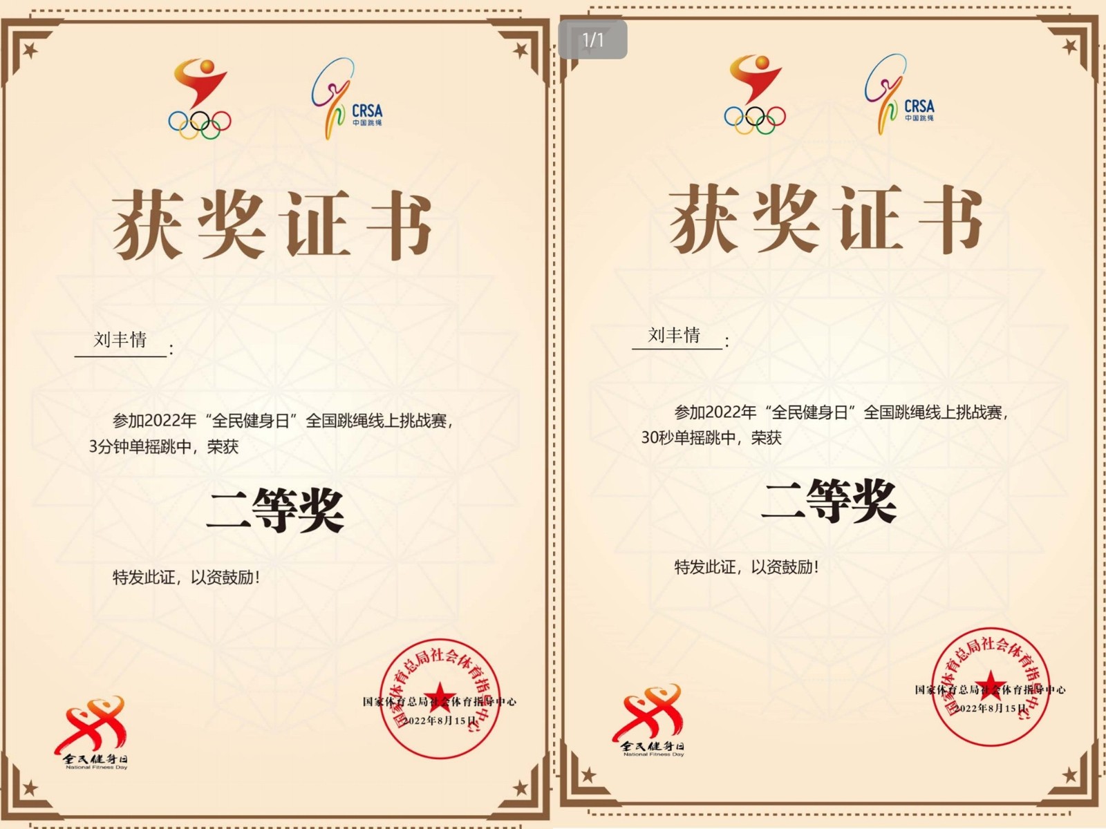 近日,正值2022年“全民健身日”之际,由国家体育总局社会体育指导中心、群体体育司等部门主办的多项体育赛事如期举办。法学院2021级学生刘丰情在全国跳绳线上挑战赛、全民健身线上运动会等比赛中斩获多项大奖。