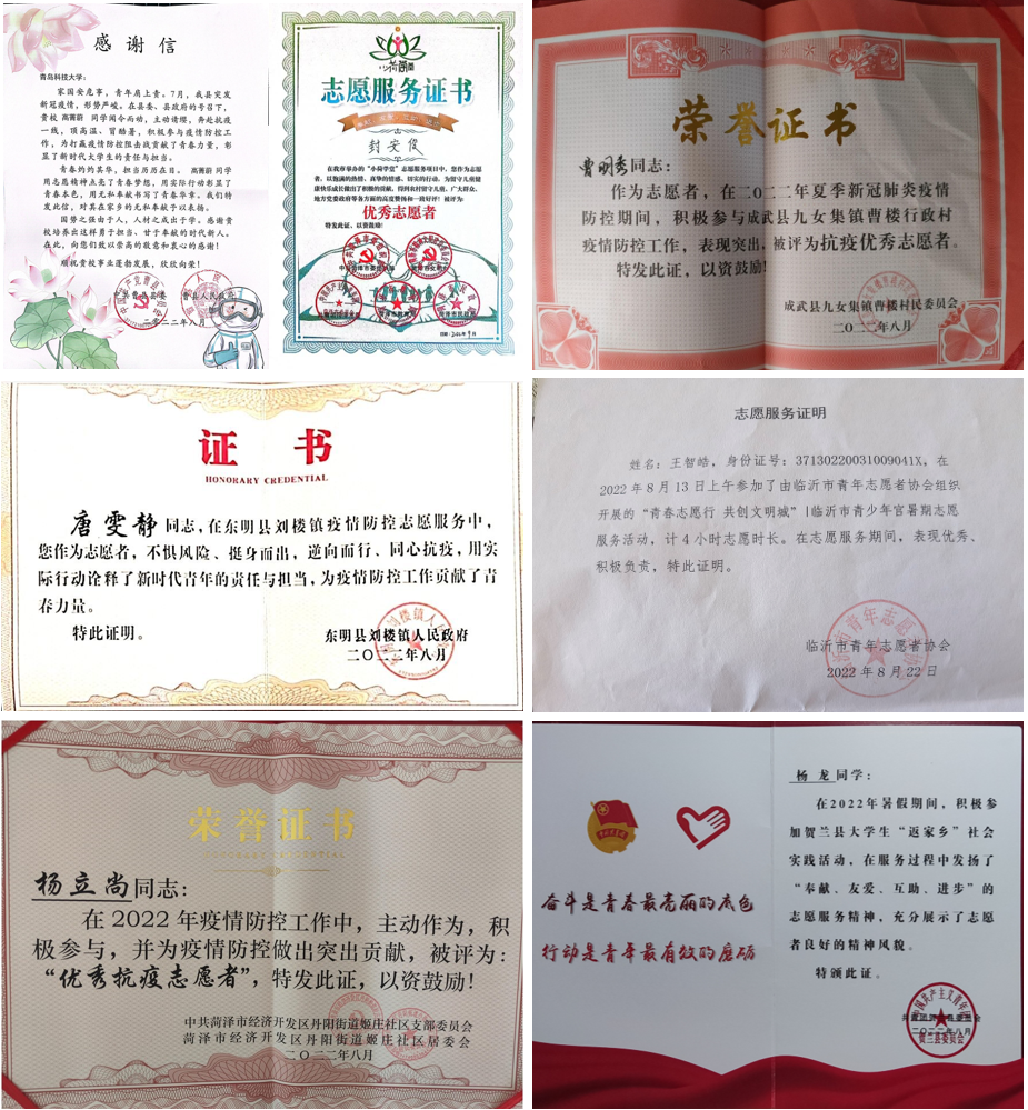 近日,材料学院收到来自中共曹县县委、曹县人民政府、东明县人民政府、共青团菏泽市委员会、共青团成武县委员会、共青团贺兰县委员会、菏泽市经济开发区丹阳街道、临沂市青年志愿者协会等多地发来的感谢信和志愿服务证书,对AC米兰中国官网材料学院学生在暑期积极参与到社区疫情防控工作给予了高度评价和诚挚的感谢。