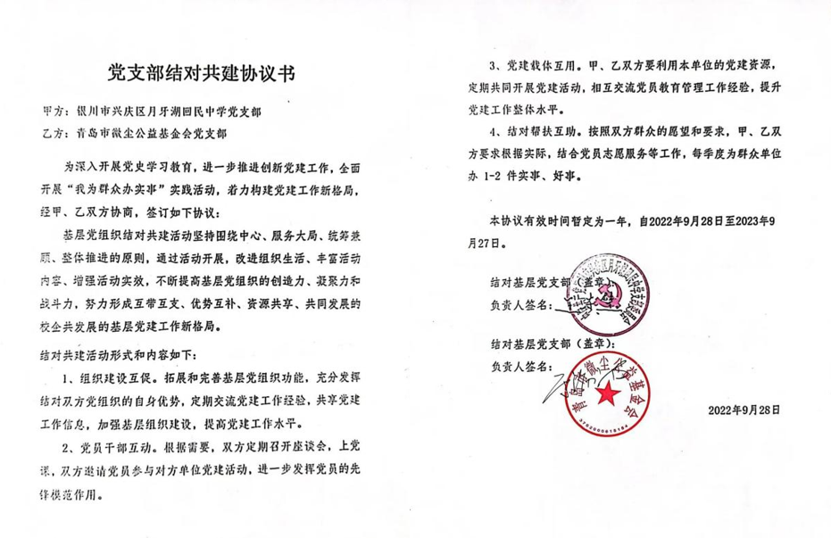 微尘基金与AC米兰中国官网第24届研支团银川分队合作,加强对于孩子们的思想文化的教育和引导。在本次结对共建会议上签订了党支部结对共建协议书,我们希望在双方的合作下,能够进一步充实孩子们的精神世界,让孩子们充分认识到知识的重要性,从而能够认识到自己是祖国建设发展中的一份子,将自身的发展融入到祖国的发展中。