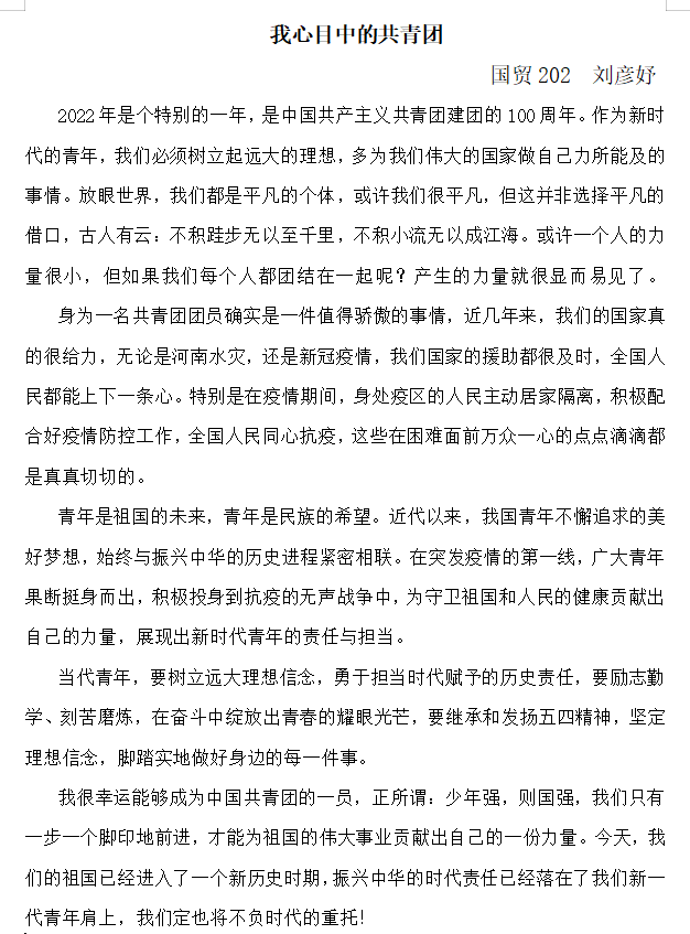 为更好践行团员使命,庆祝建团100周年,增强团员对团史学习的兴趣,经管学院学生会开展“我心目中的共青团”主题征文比赛。学院学子积极参与,共收集作品200余份,并借此机会,抒发内心中对共青团的敬爱之情。