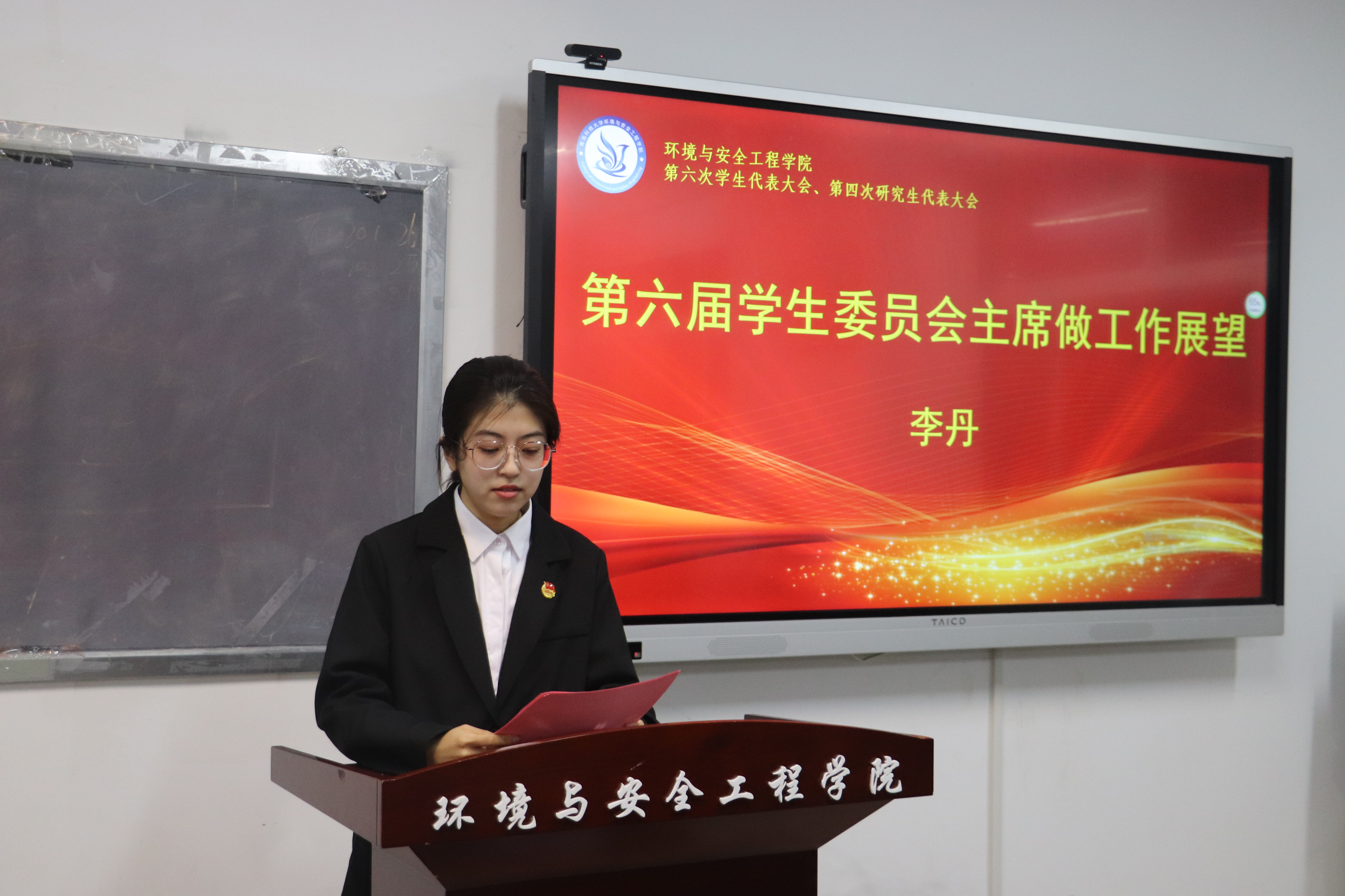 学院学工办主任兼团委书记钟硕为新一届学生会、研究生会主要学生干部颁发聘书,新一届学生会执行主席李丹、新一届研究生会执行主席宫姝丽作了表态发言和工作展望。