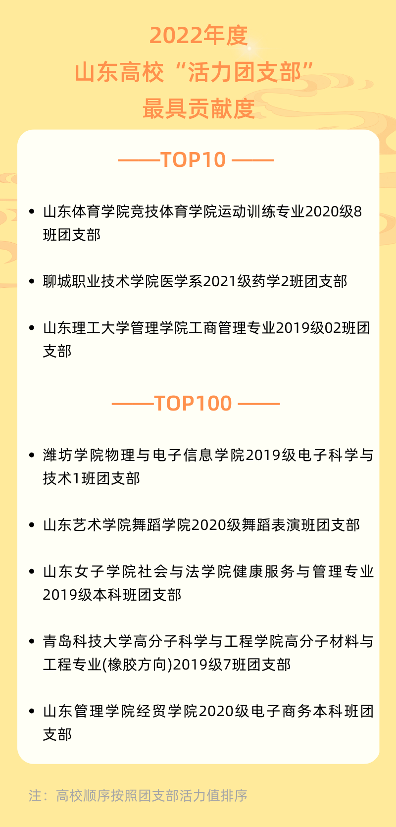 据悉,2022年5月起,为深入贯彻“全团抓思想政治引领”、“全团大抓基层”、“全团抓学校”工作部署,落实《关于改革创新高校共青团工作 切实增强思想政治引领实效的若干措施》,激发高校团支部活力,团中央基层建设部指导中国青年报社开展了2022年度高校“活力团支部”风采展示活动。活动经过校内选树、校级展示、省级展示、全国展示等环节,最终评选出在“引领力、组织力、服务力、贡献度、改革味、好作风”方面表现突出的高校团支部,产生《2022年度全国高校“活力团支部”最具贡献度TOP100榜》等榜单,为进一步推动全国高校基层团支部规范建设和活力提升提供了样板支撑。