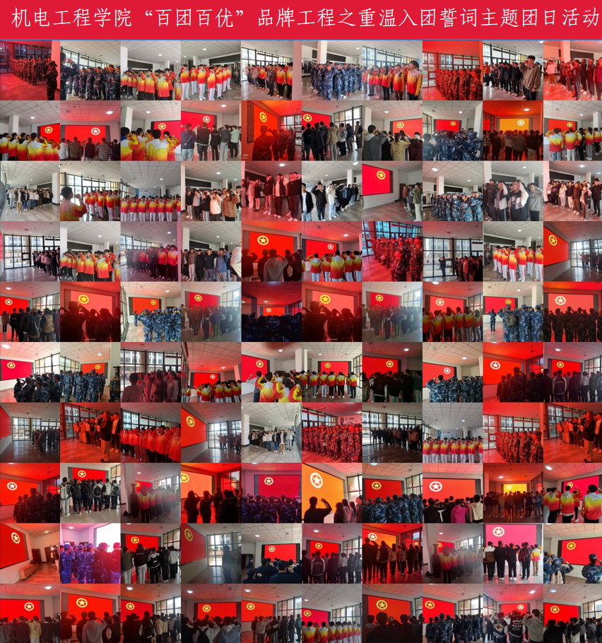 坚定理想信念,奋发砥砺前行。学院团委结合“百团百优”工程开展“重温入团誓词”等团日活动。机电学院142个团支部在学院楼前重温入团誓词,在铿锵誓言中树立远大的人生理想。每位同学怀揣着理想与信念,在团旗下庄严宣誓,担当的青春最精彩,奋斗的年华最美丽,勇做走在时代前列的奋进者、开拓者、奉献者。