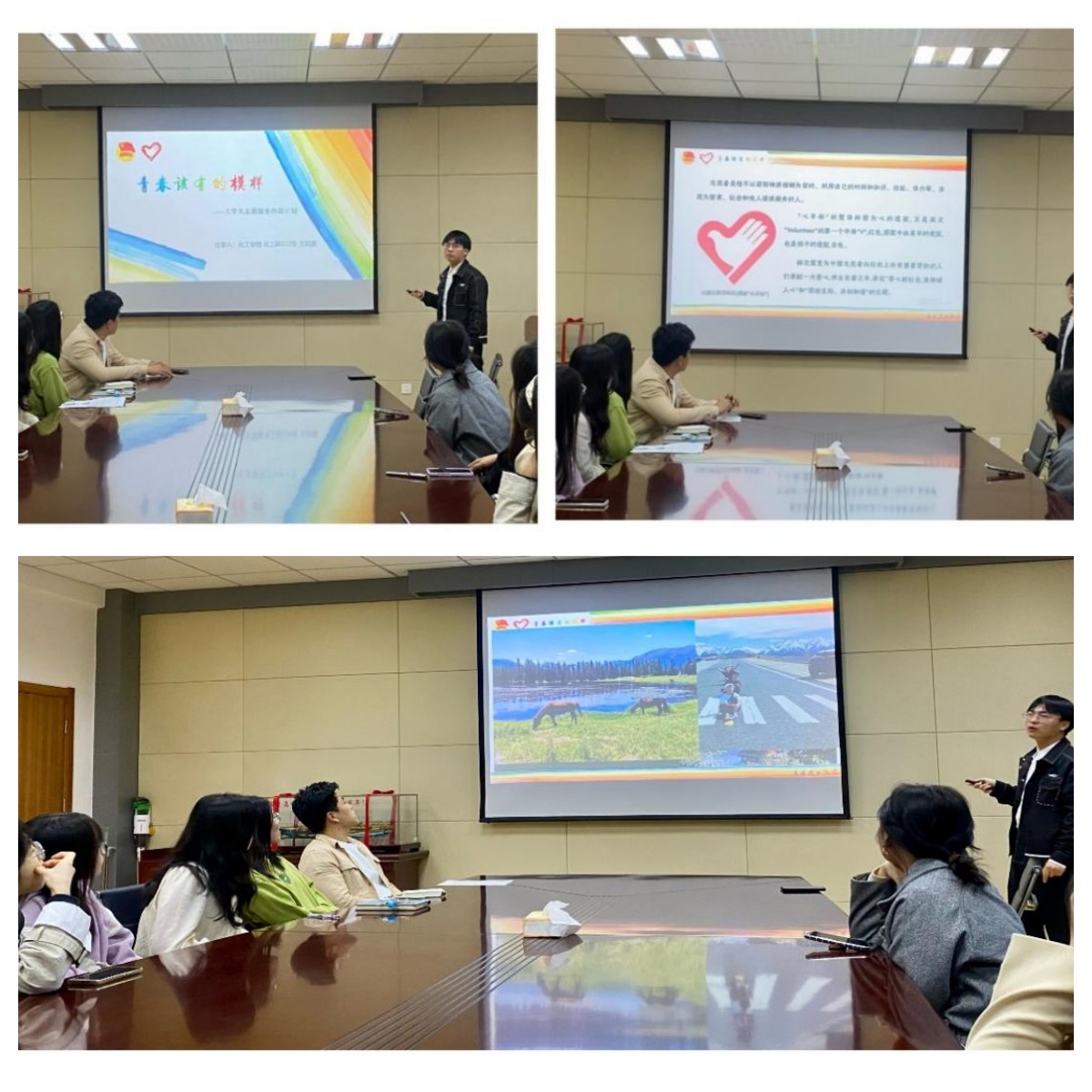 王启真分享了自己在西部任教的经历,解读了相关政策和保障措施。在介绍自己的服务经历时,他学长通过一张张承载不同故事的照片,多角度展现了他在西部任教期间的点滴。朴实真挚地讲述了他扎根基层、踏实工作、服务人民、超越自我的经历,畅谈了自己在服务地的成长与感受。在他对自己的初心选择、日常工作和西部风土人情的介绍中,所体现的青年的情怀和担当感染了每一位同学,同学们对为西部计划执着坚守、奉献青春的志愿者有了更加深刻的理解和认识。最后他以“当奉献成为习惯,青春才会焕发光彩”进行总结,升华志愿情怀,激发同学们的兴趣和热情,坚定建设祖国西部的决心。