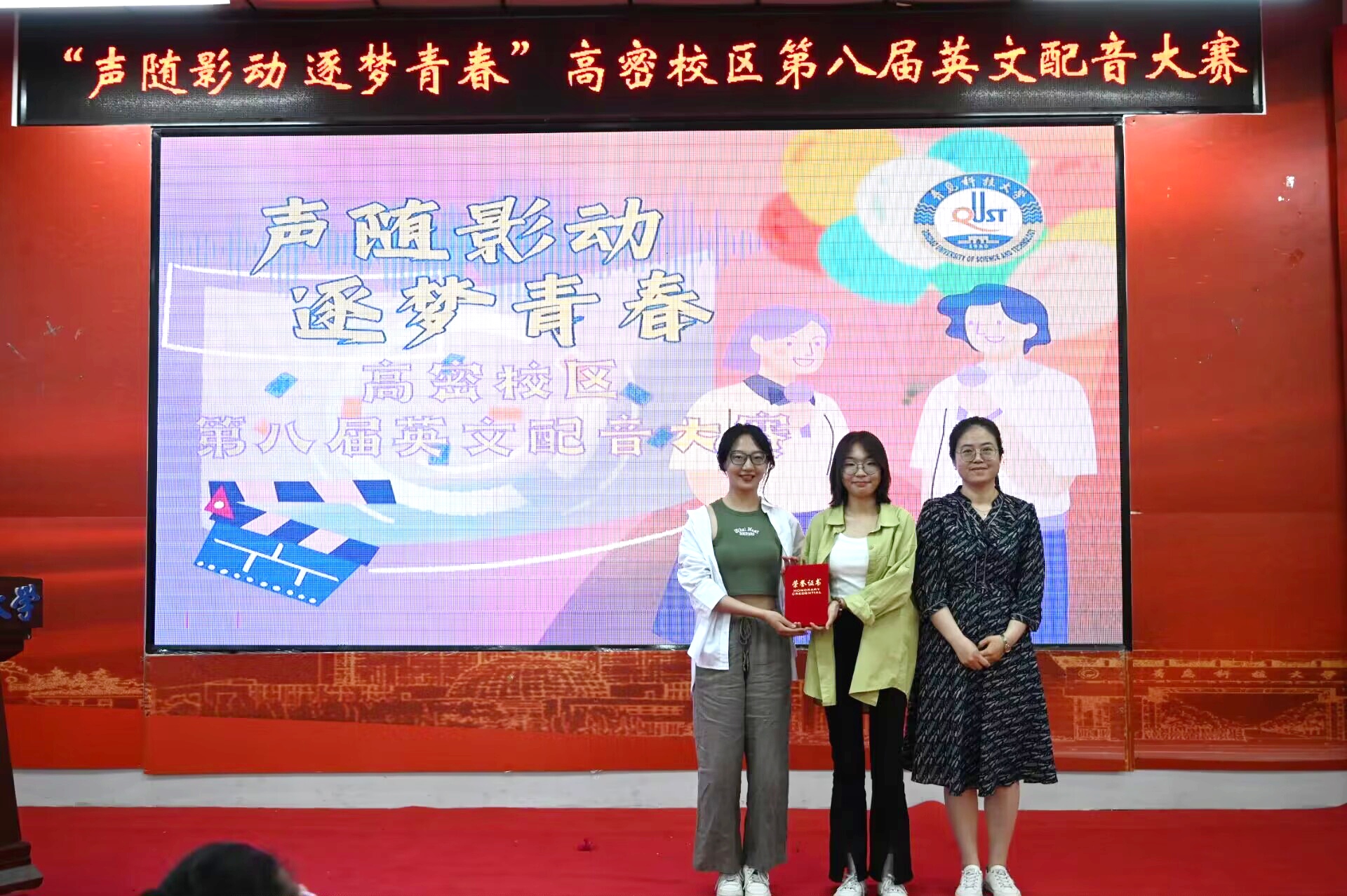 5月17日晚,高密校区“声随影动,逐梦青春”第八届英文配音大赛于通德会堂201举行。英语专业教师王妮、蔡振群、张洁,辅导员李鹏飞、秦鹏涛担任决赛评委。