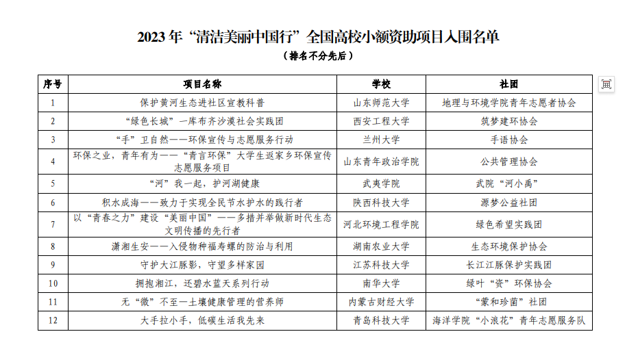 据悉,由生态环境部宣传教育中心、花王(中国)投资有限公司共同主办的“清洁节水中国行 一家一年一万升”活动已连续十二年在全国开展。自2021年起,活动将宣传方向从节水转向更广泛的生态文明建设领域,同时将项目名称升级为“清洁美丽中国行”。今年,通过2023“清洁美丽中国行”微信小程序,活动共收到来自全国19个省(自治区、直辖市)94所高校的项目方案共计146份。