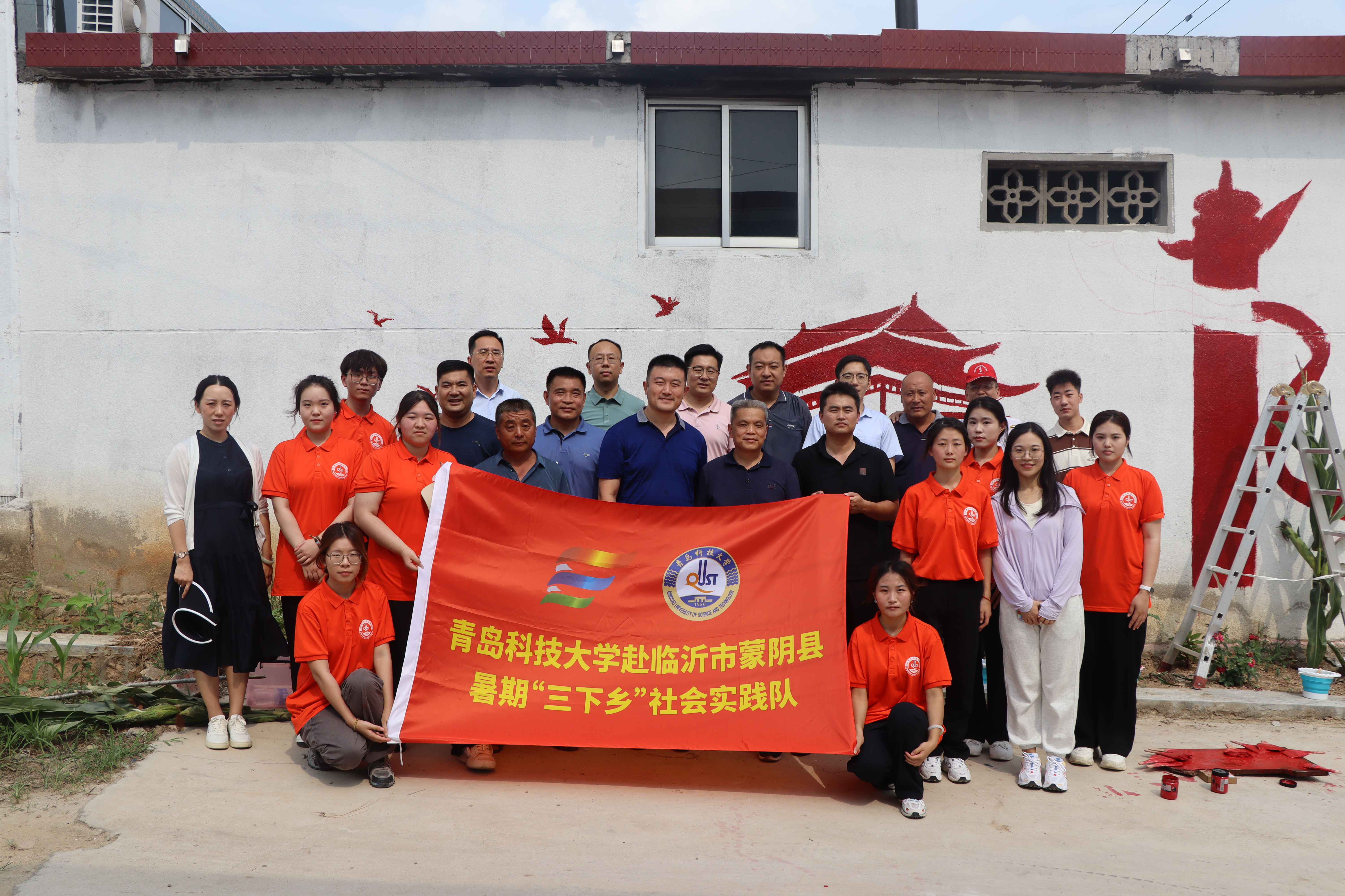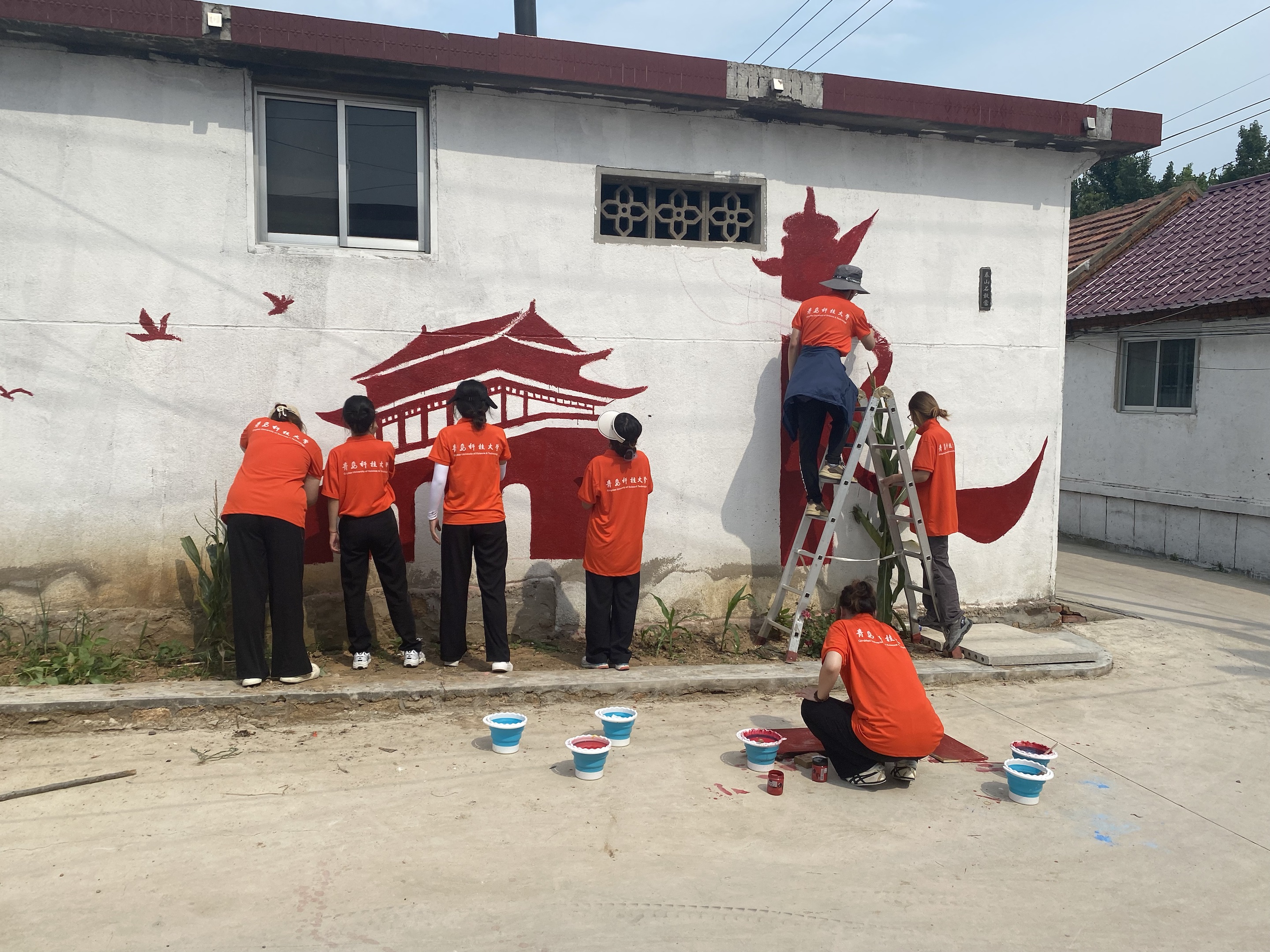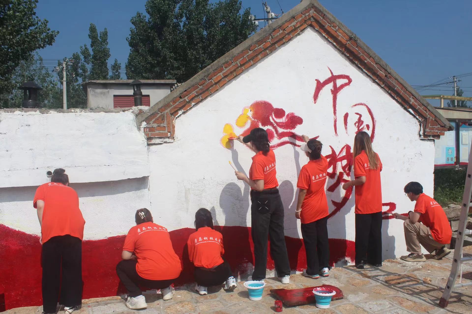 开展乡村墙绘活动。7月19日,学校团委副书记陈兵一行看望正在开展墙绘活动的实践队员。本次实践得到省派蒙阴县联城镇第一书记刘宝成、闫传新的大力支持。8名实践队员骄阳似火斗酷暑、挥汗如雨战高温。他们先是在纸上提前构思设计,然后用粉笔在墙上进行草图绘制,最后在调色上色。一勾一点、一笔一画,以墙为画卷,为村庄增添了一抹靓丽的色彩。实践队员用自己的双手和辛勤的汗水投身火热社会实践,让青春的足迹活跃在中国大地上,彰显了新时代大学生的青春风采。