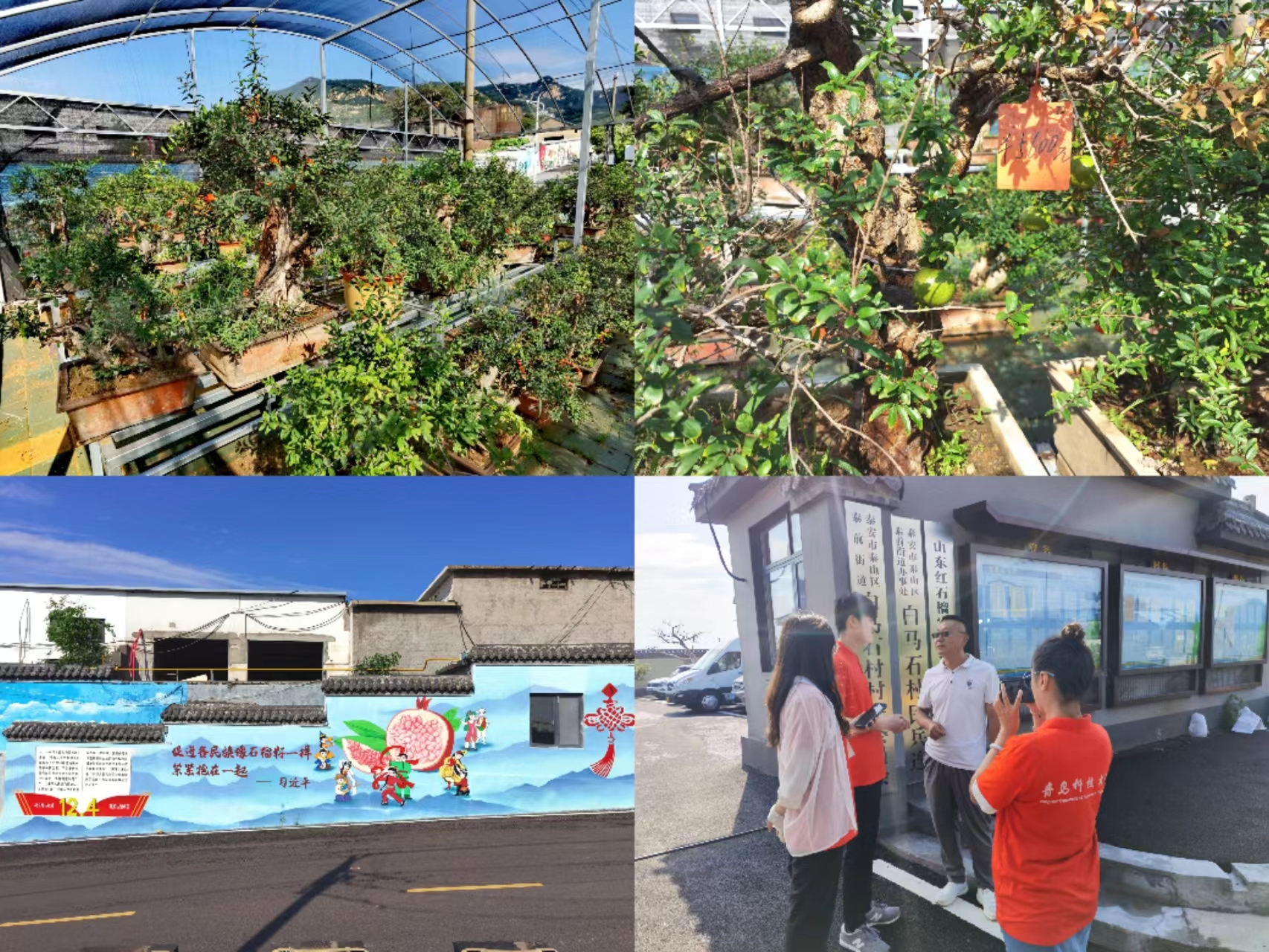 随后,实践队在相关负责人带领下参观了石榴盆景园,石榴盆景观赏性强,经济价值高,平均每盆售价在5000元左右。除盆景外,白马石村积极探索石榴茶生产、特色采摘、直播带货等一二三产业融合发展新路径。在收获经济效益的同时,白马石村注重为“石榴”赋予文化内涵,村里随处可见的文化墙上描绘了民族团结如石榴籽般紧紧抱在一起的画面,队员们切实感受到了“红石榴精神”。