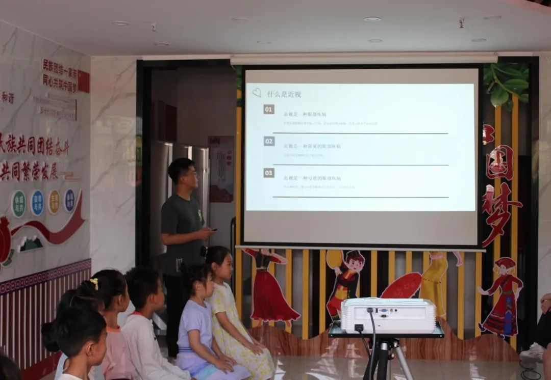 调研团成员张文佳为孩子们带来“用眼健康科普”专题课堂。她重点讲解了常见的眼部问题和预防方法。她向学生们介绍了近视、眼疲劳、干眼症等常见问题,并提供了预防和缓解这些问题的方法。她使用实际案例和图片来说明这些方法的实施步骤,并强调了正确用眼和保护眼睛的重要性。她还组织了一些实践活动,让学生们进行眼保健操和眼部按摩的练习。通过这些活动,学生们可以亲身体验到眼部按摩的舒适感,并学会一些简单的眼保健操动作。这样一方面可以缓解眼部疲劳,另一方面也能让学生们更加深入地理解眼保健的重要性。