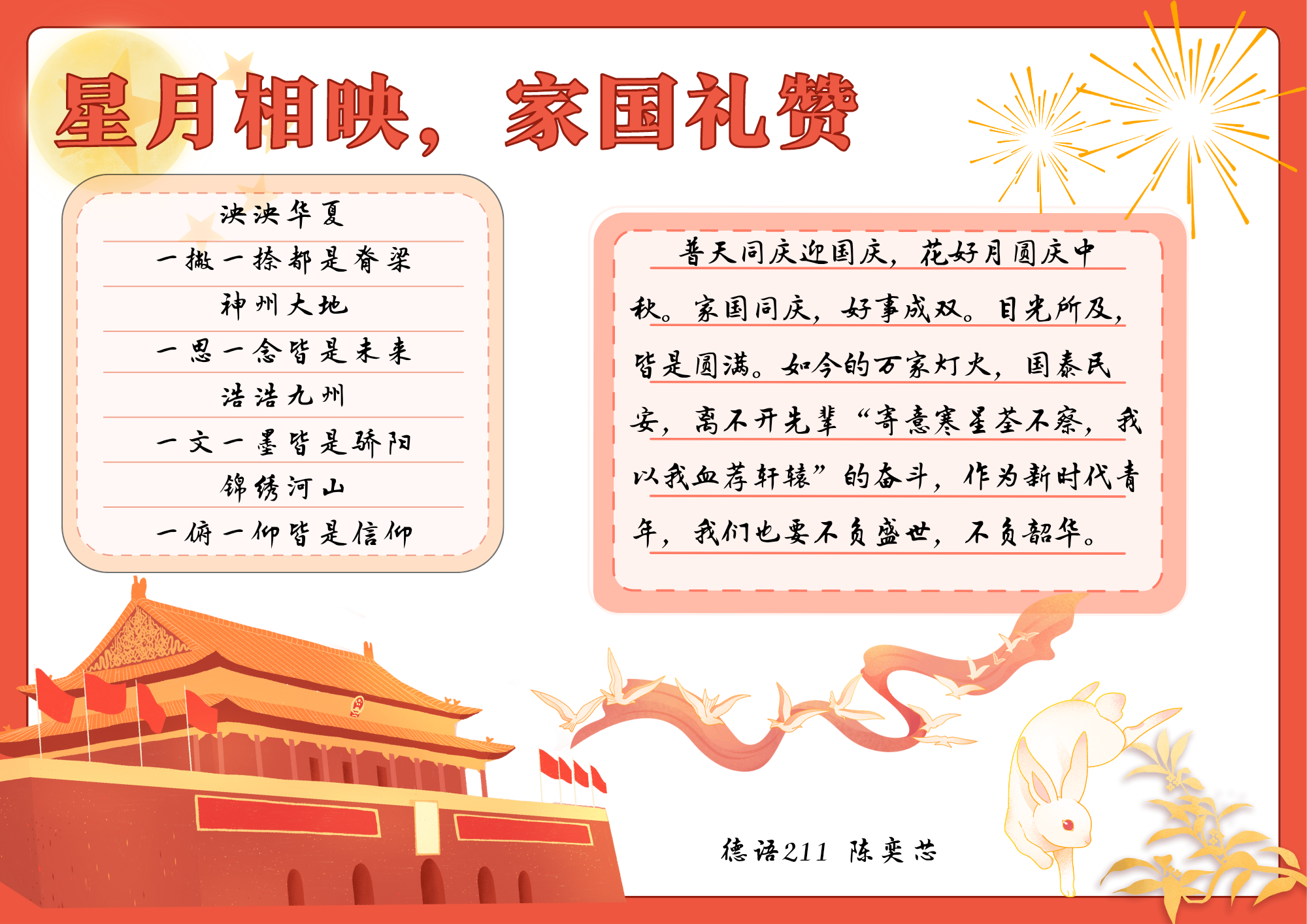 为加强对学生的爱国主义教育和民族精神教育,外国语学院开展“挺膺担当砺青春,盛世华诞谱新章”中秋国庆双节主题教育系列活动,弘扬爱国主义精神,传承优秀传统文化,增强文化自信,厚植学生爱党、爱国情怀。