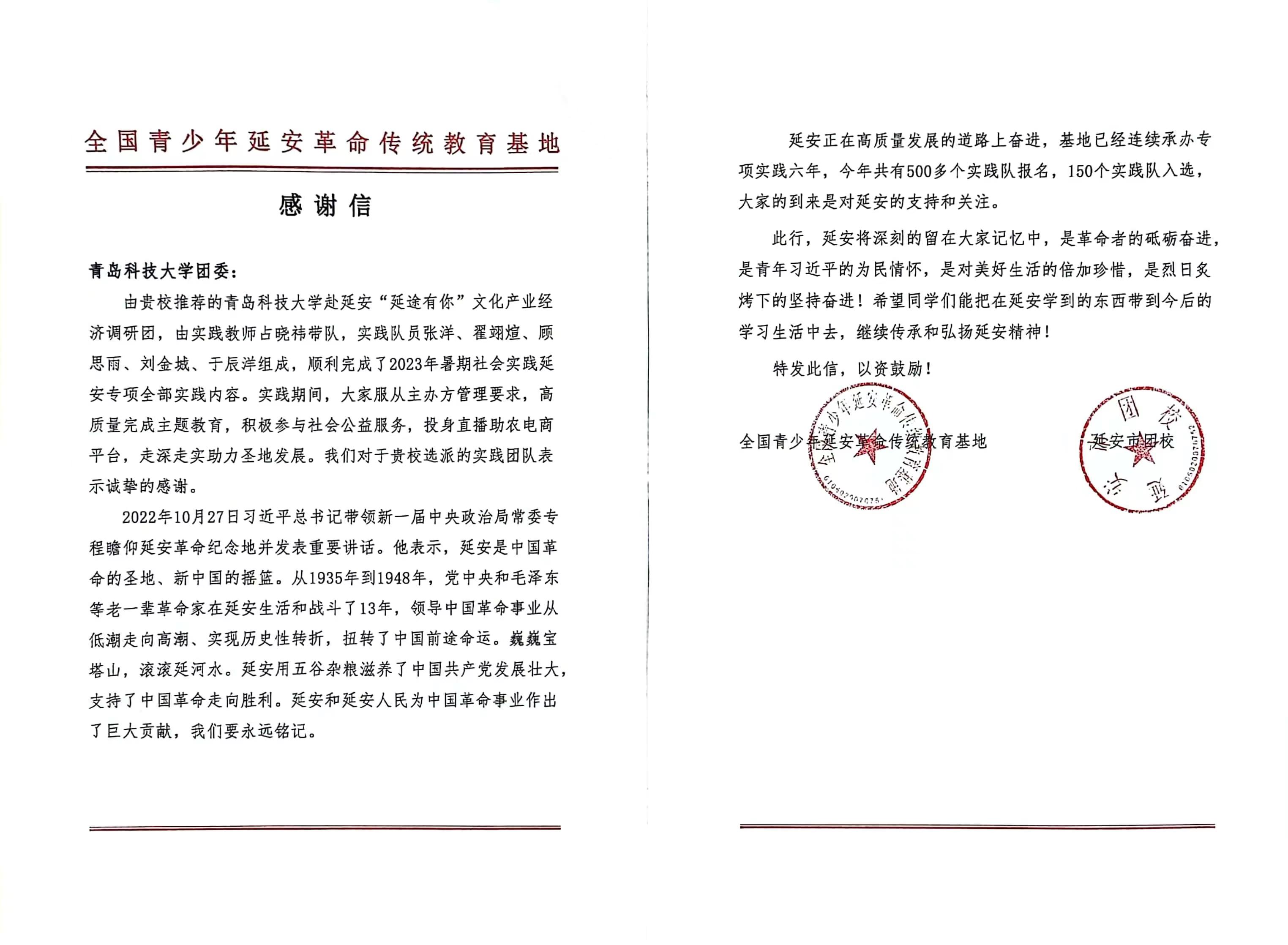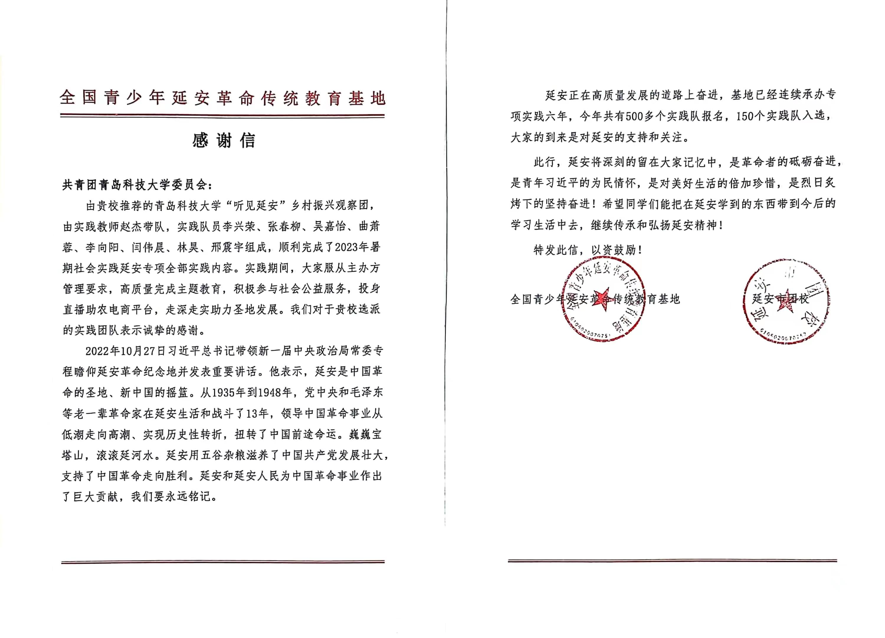 近日,全国青少年延安革命传统教育基地、延安市团校向经管学院发来感谢信,对学院实践团队认真完成实践内容,结合专业优势多途径助力延安高质量发展表示感谢。