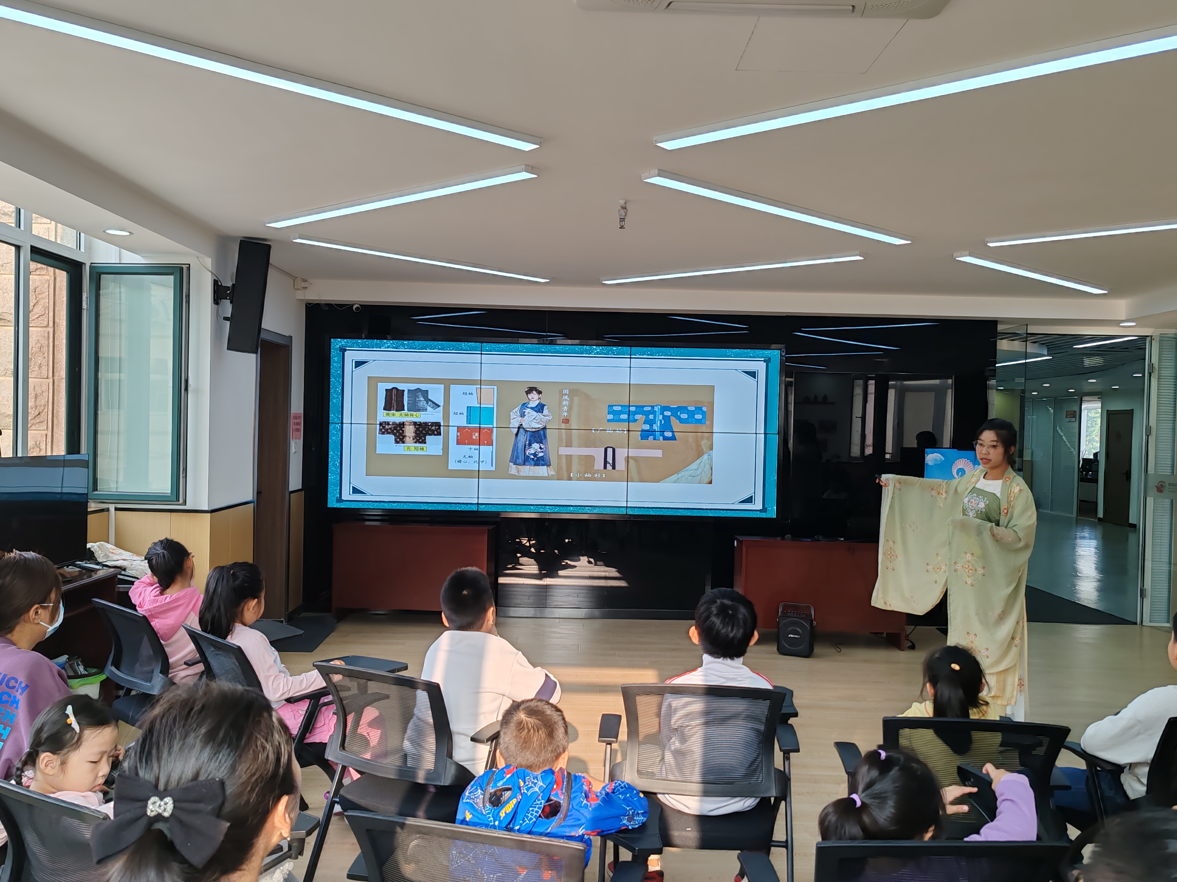 志愿者们讲解的内容以服装的重要性和差异性为核心,重点带领小朋友们了解了汉服的发展历程与特点,同时还学习了汉服和服与韩服的区别。在学习的过程中,小朋友们认真听讲,踊跃回答志愿者们提出的问题,课堂氛围十分活跃。志愿者们还带领小朋友学习了在日常生活中用英语,日语,韩语夸赞其他人的说法,小朋友们能做到迅速地掌握和应用。