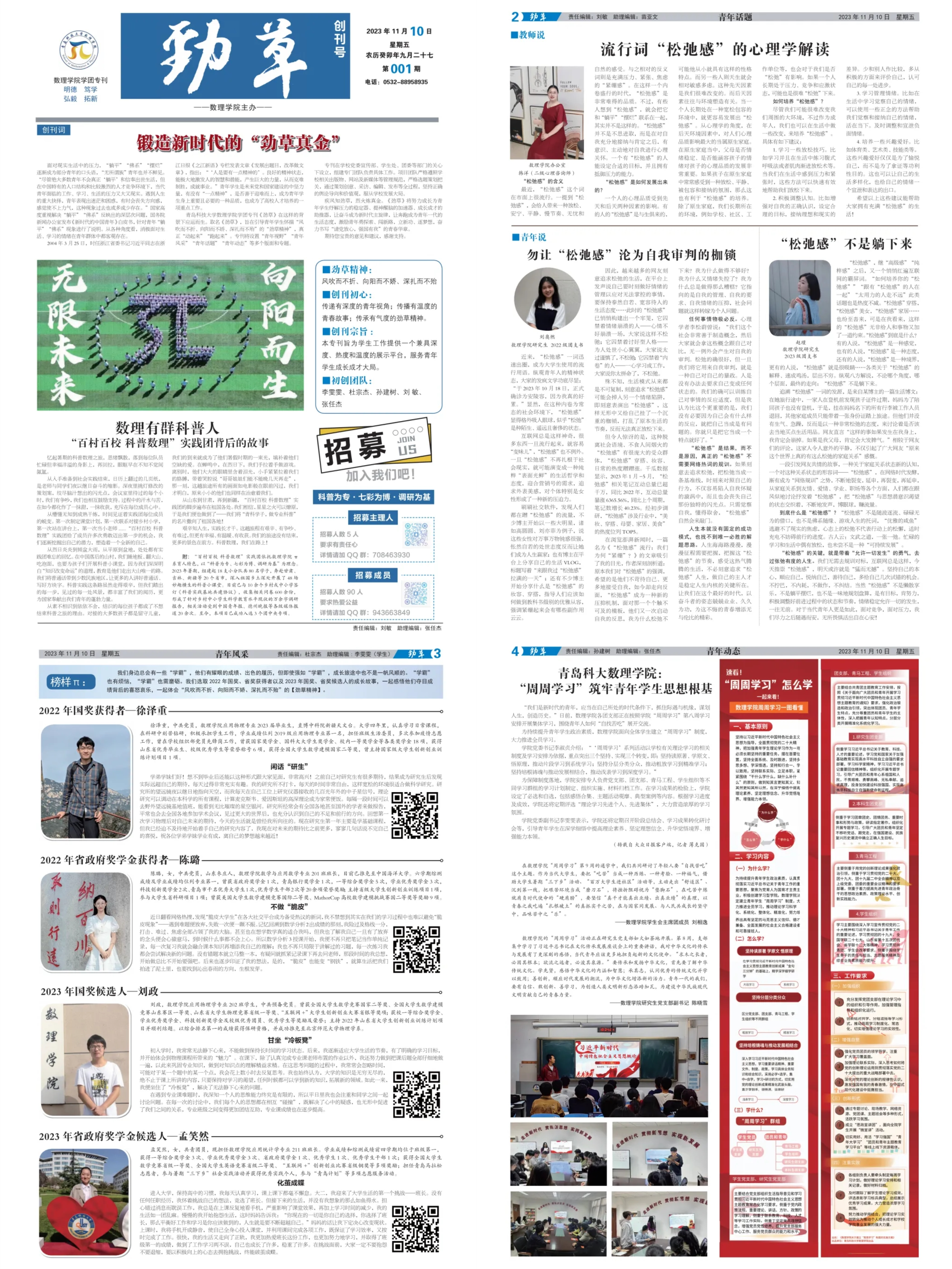 专刊设置“青年视野”“青年话题”“青年风采”“青年动态”四个版面。其中,“青年视野”版面主要报道教育领域的重大决策部署、重要事件、重点活动,展示学校学院教学、科研、管理等方面的重要成果及热点亮点等。“青年话题”版面主要分“教师说”和“青年说”两个模块,主要为青年师生针对当前热点话题展开集中讨论,提升青年学生思想深度。“青年风采”版面主要展现典型青年人物,通过展示人物事迹、讲解人物故事,充分发挥榜样引领作用。“青年动态”版面发布学生工作的重要活动和动态,例如重点活动、特色工作、会议内容等。首期通过不同角度主要展示学院近期特色教育活动“周周学习”。
