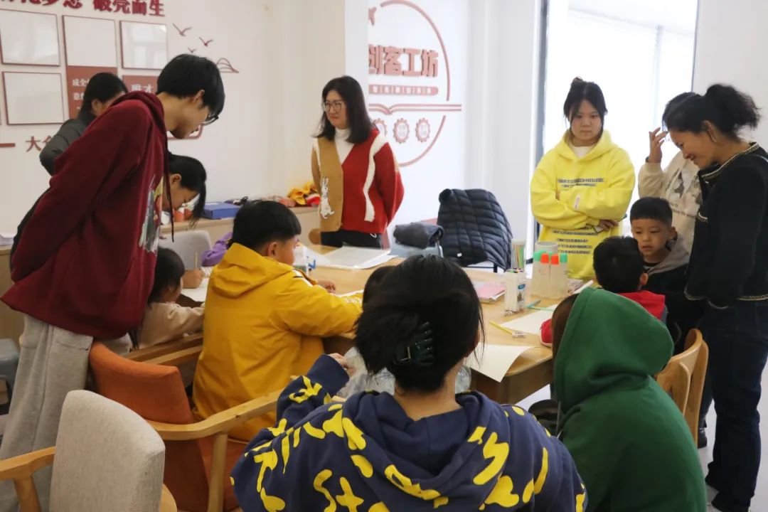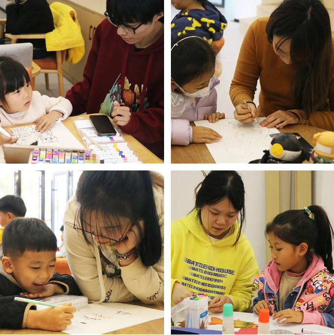 在由宁心怡和丁力主讲的《幸福一家人》主题创意绘画课上,两位志愿者通过引导式的询问帮助小朋友们认识父母的辛劳与家庭的美好,而小朋友们在课堂上无拘无束的创作与洋溢的笑脸,也让志愿者感到一股热流拂过心间。