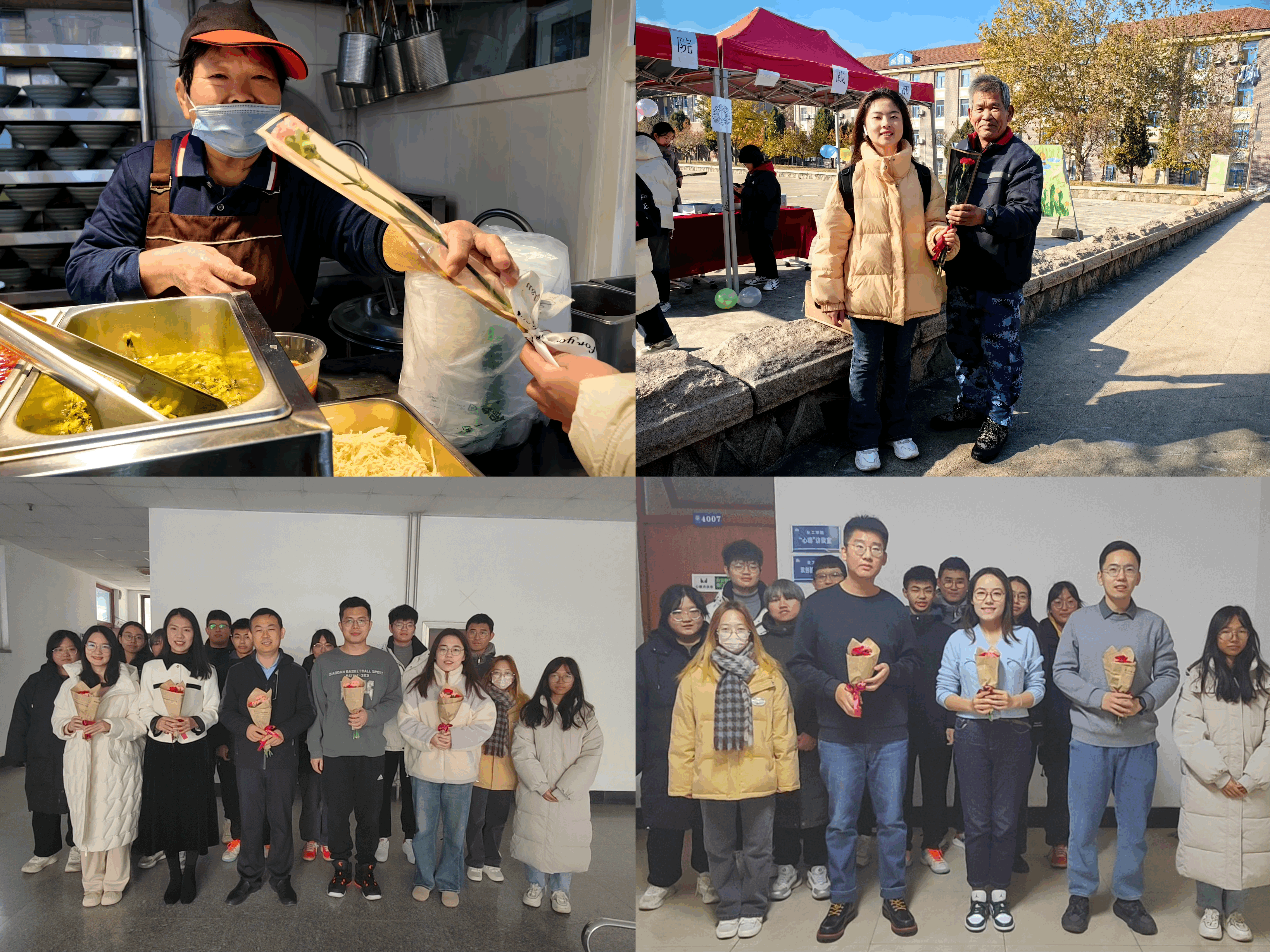 同学们在小五四广场领取鲜花赠予辅导员、任课老师、后勤工作人员等并合影留念。一支鲜花代表同学们浓浓的感谢,合影中每个人都面带微笑,眼中满是幸福与感动,这一活动让同学们学会感激,让教职工得到感动,同学们用实际行动表达出对身边人的感激之情。