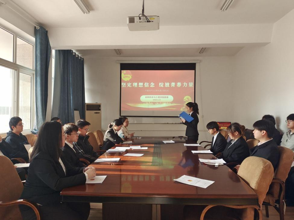 为深入学习宣传贯彻党的二十大精神,激发新团员的自豪感和归属感,2023年12月5日下午,材料学院在学院楼203举行“坚定理想信念,绽放青春力量”新发展团员入团仪式,材料学院团委老师刘爽和全体新发展团员参加本次仪式。入团仪式由学院优秀共青团员代表张思祎主持。