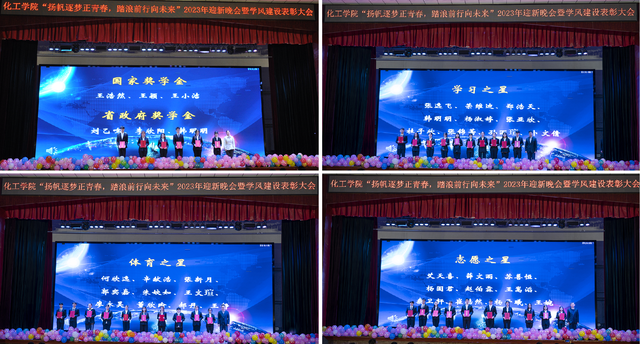 晚会中场进行学风建设表彰颁奖环节,孙明媚为国家奖学金、省政府奖学金、山东省先进班集体、青科好班长获奖学生颁奖;李春家为“十大自立自强标兵”、学习之星、实践之星获奖学生颁奖;刘永卓为体育之星、科创之星获奖学生颁奖;秦洪庆为获得志愿之星获奖学生颁奖。