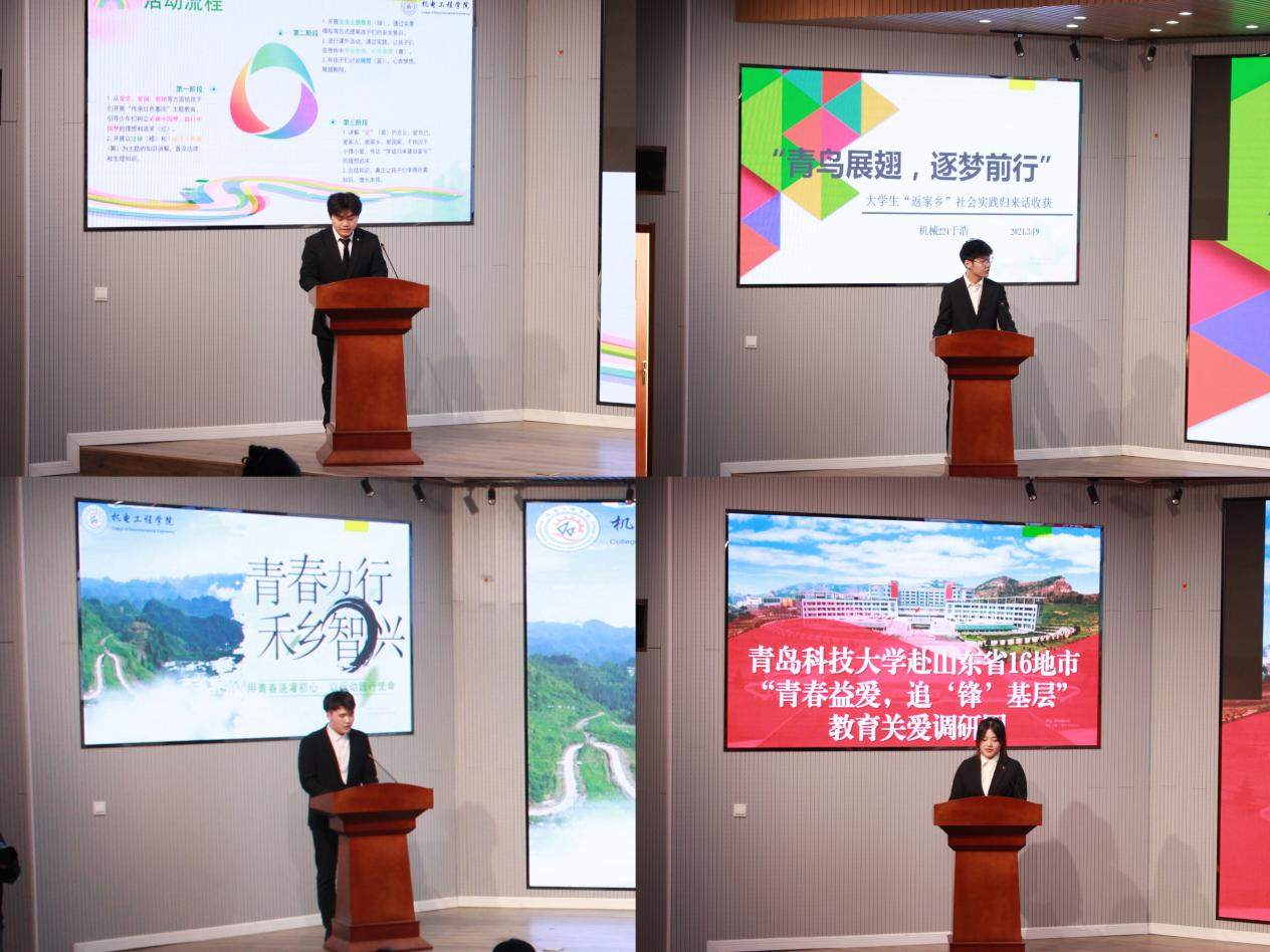 活动分2024年寒假实践归来话收获成果分享和“家乡代言人”选拔评审两个环节,主要涵盖“青鸟计划”体悟锻炼、“返家乡”社会实践、团中央专项团队志愿服务、走访企业见习实习等。答辩人依次从活动概述、优秀案例、实践成效、创新做法、活动感悟等对寒假社会实践进行总结与回顾,通过PPT、视频、答辩相结合的形式展示社会实践成果,实践内容充实,调研范围广泛,着眼经济、关注民生,展现了机电学子在火热实践中“受教育、长才干、作贡献”的责任与担当。