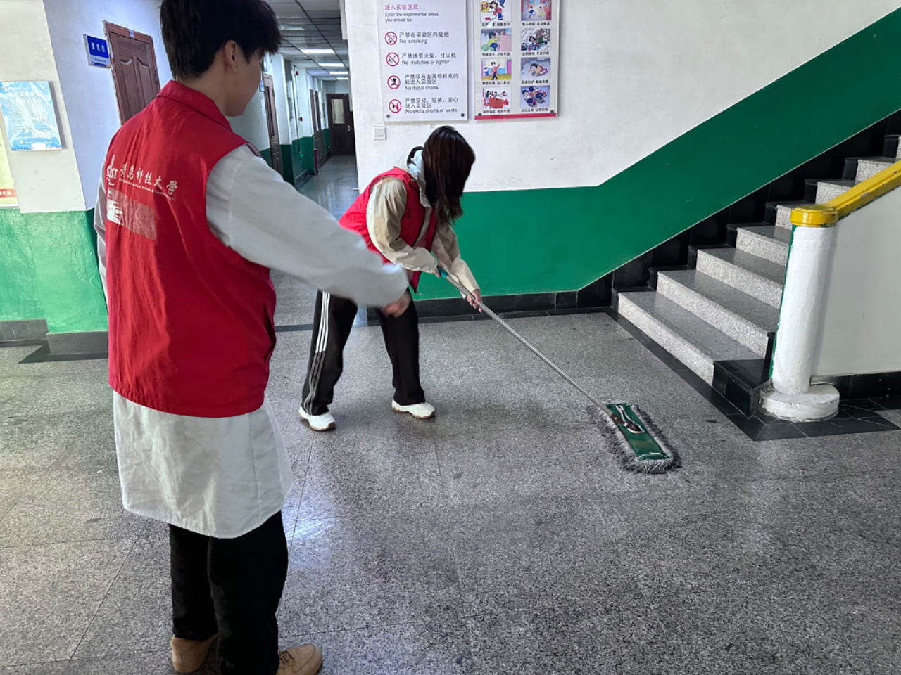 学院后天环保协会组织志愿者一起打扫学院楼的卫生,志愿者们拿起劳动工具,对学院楼的走廊、实验室、卫生间等展开“地毯式”清扫,为同学们营造一个更加整洁、舒适的学习环境,以实际行动助力营造良好的校园环境。