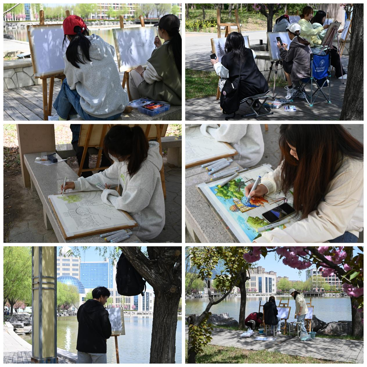 校区23级艺术专业青年学子在老师的引导下,走出教室,开始在春风如画的校园内寻找灵感。明镜湖边、图书馆前,青年学子们共同描绘青科的美丽风光。专注的创作、精湛的笔触、严谨的构图,引得过路的同学、老师纷纷驻足观赏。青年学子们以各自独特的视角,描绘了校园内的一道道风景线。