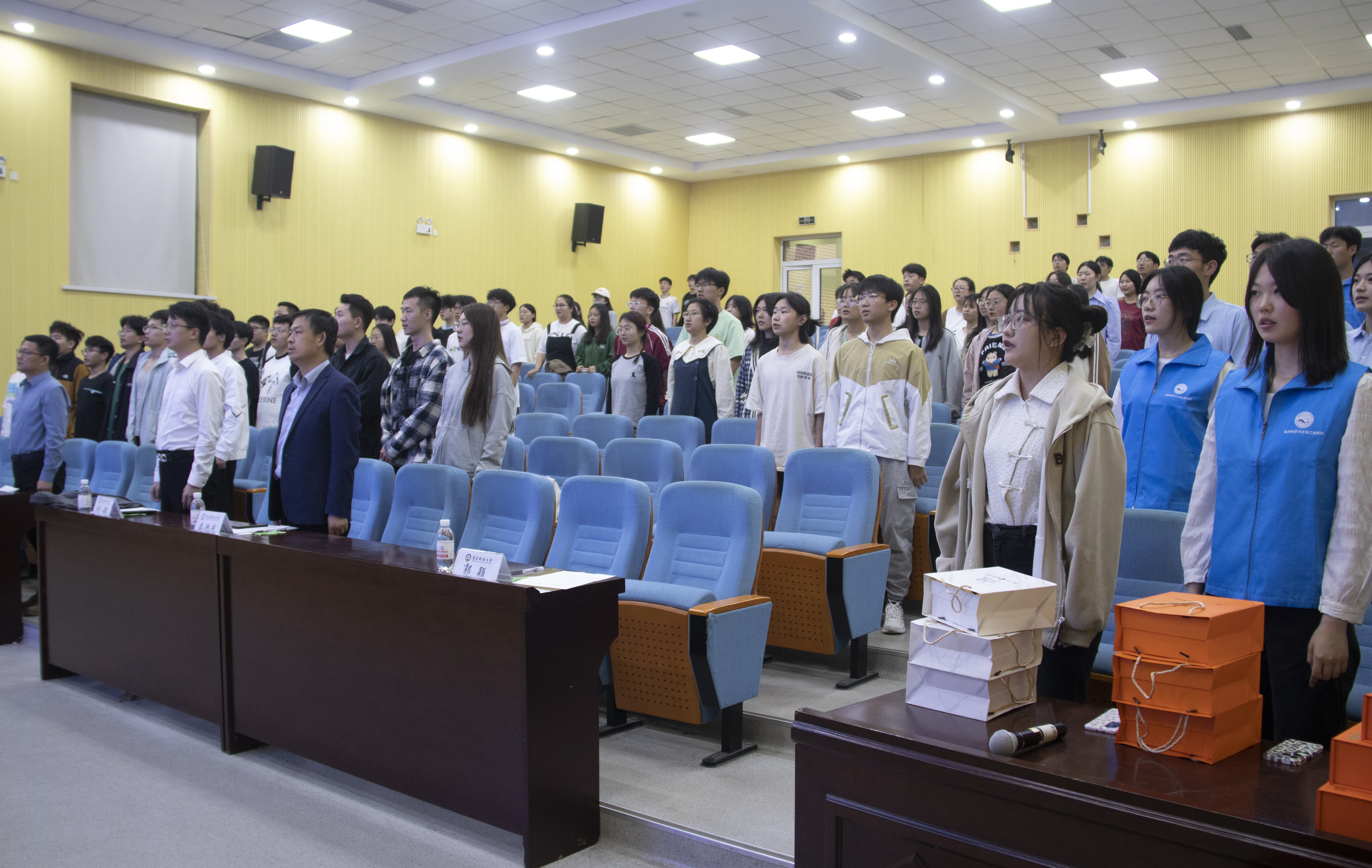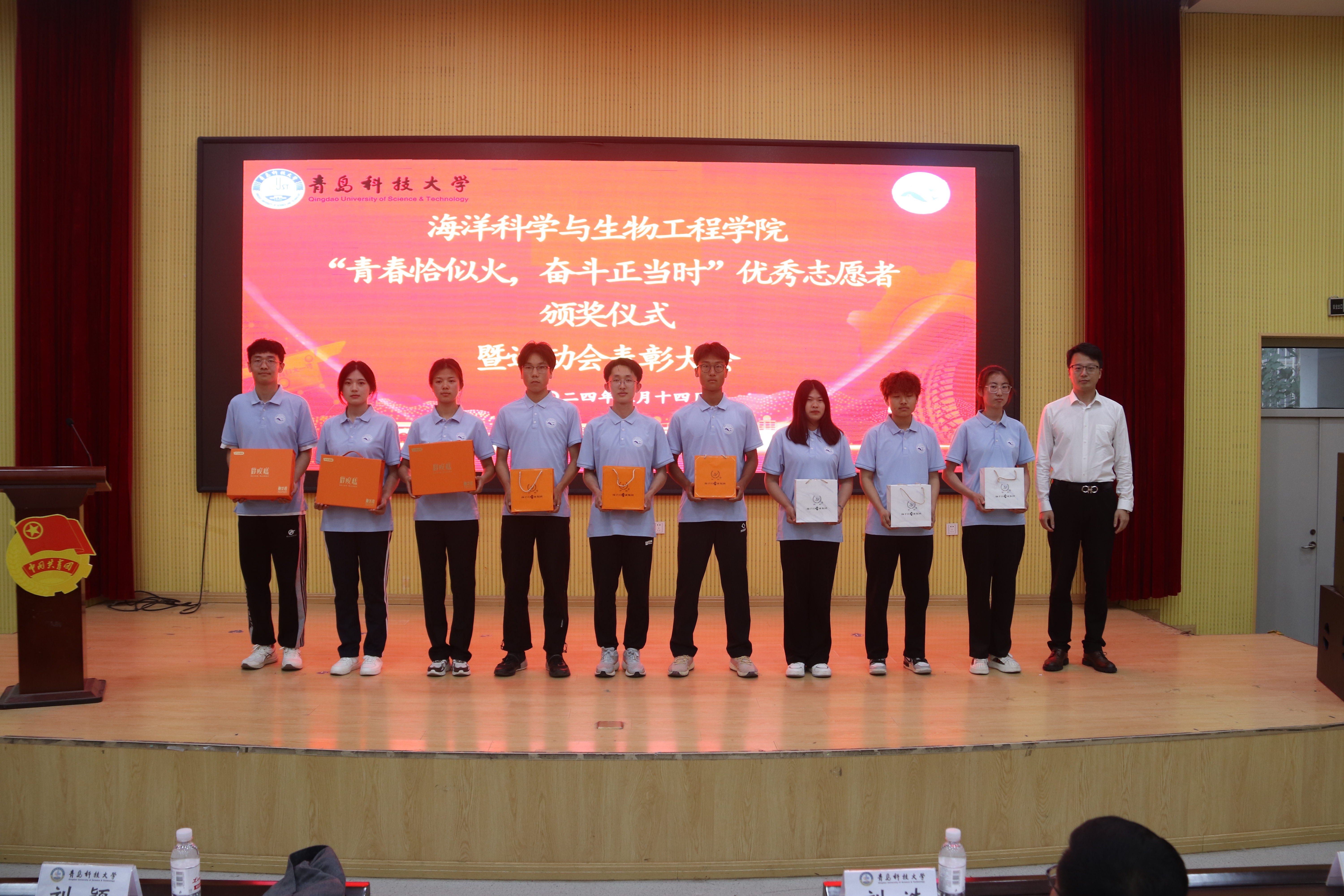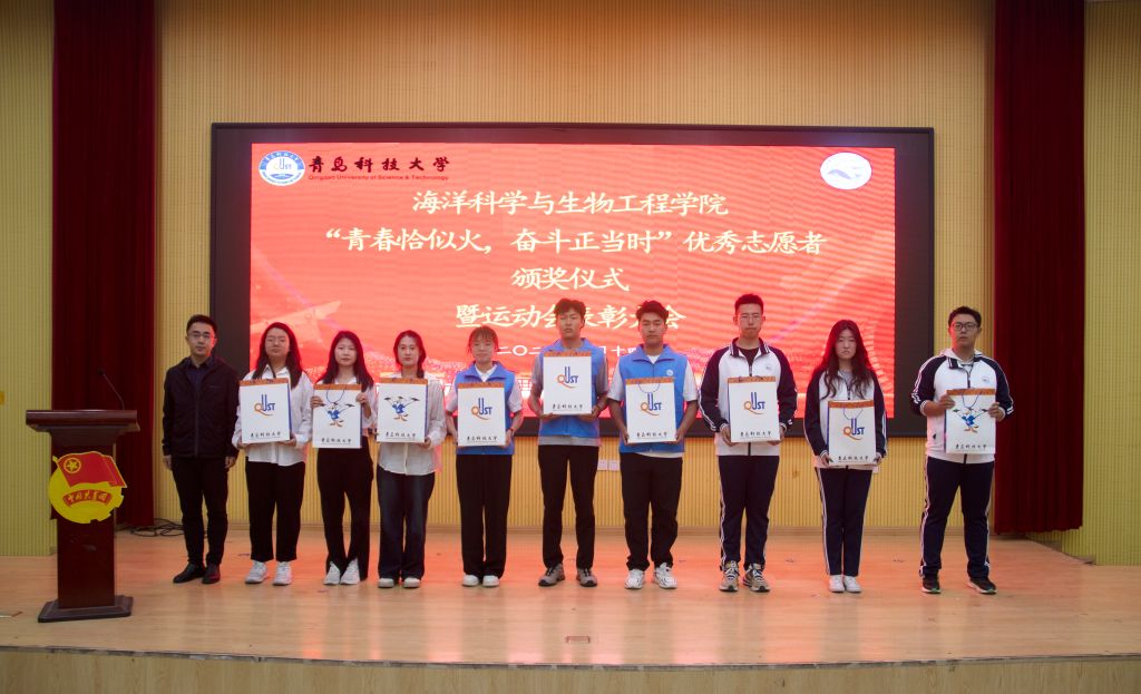 为积极培育和践行社会主义核心价值观,大力弘扬“奉献、友爱、互助、进步”的志愿者精神,表彰在过去的一年中在志愿服务和社会实践中表现积极的青年志愿者;同时,为表彰海院学子在校运动会中的突出表现,鼓励海院学子弘扬体育精神,勇担时代大任,争做有为青年。5月14日,海洋学院团委于尚舜报告厅举办“青春恰似火,奋斗正当时”优秀志愿者颁奖仪式暨运动会表彰大会,海洋学院党委副书记兼副院长刘浩、扬子江药业集团青岛地区负责人刘颖、海洋学院学工办主任兼团委书记秦洪庆、团委老师吕珊珊、车玉章、郭颖和学生代表参加活动,大会在庄严肃穆的国歌声中拉开序幕。