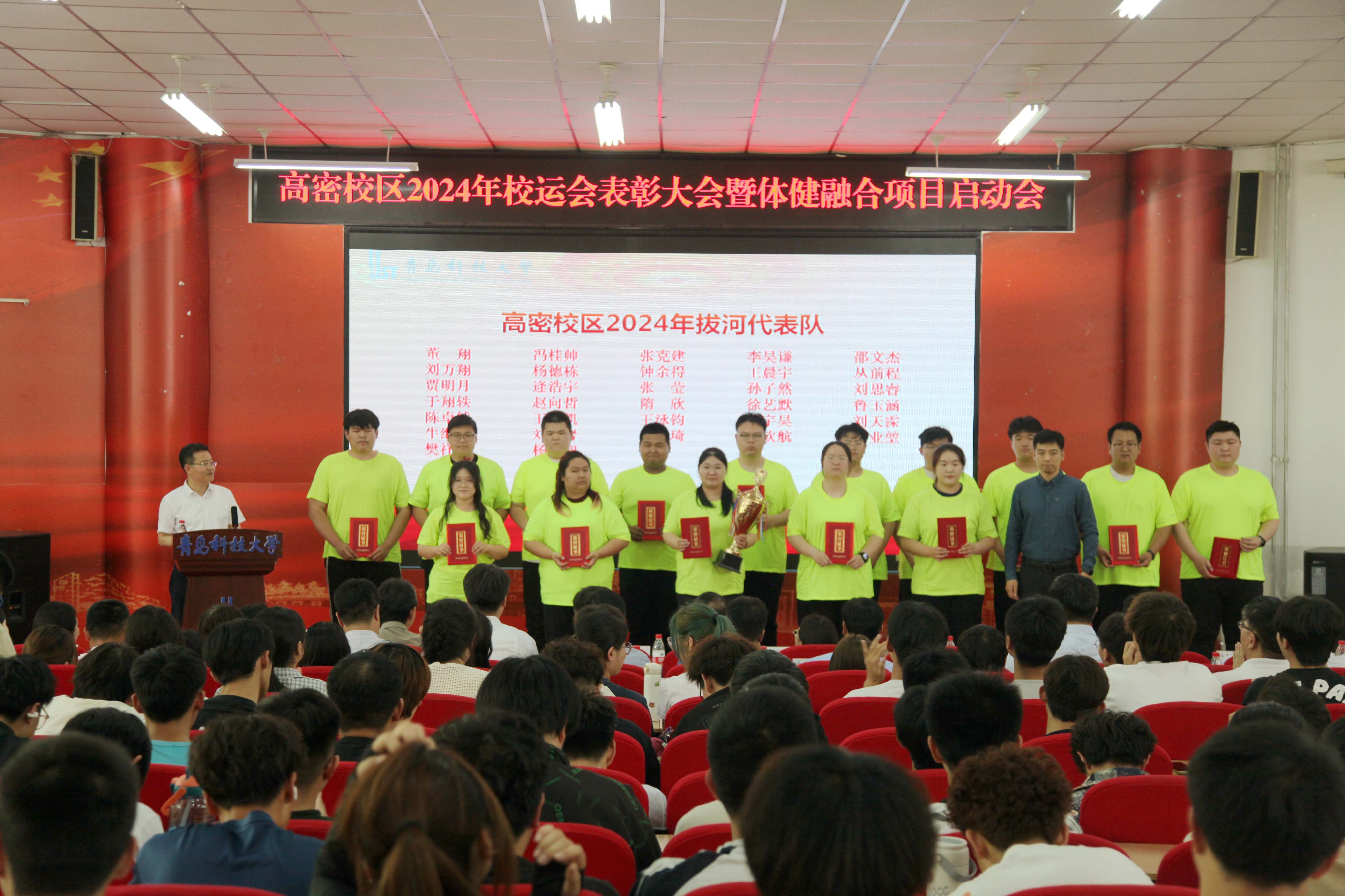 学校教务处处长马翠萍为高密校区2024年运动会优秀指导教师颁发证书,并作体健融合项目动员讲话;校区党委书记马骥为校区拔河队代表颁发奖杯和证书;学校体育综合改革办公室常务副主任楚晓东为校区2024年优秀运动员代表和优秀体育活动志愿者代表颁发证书,并宣读了《关于在高密校区开展FOOTBIKE滑行运动项目的通知》;校区党委副书记兼学生管理办公室主任王作辉宣读了《关于表彰高密校区2024年优秀运动员、优秀体育活动志愿者、拔河队员、优秀指导教师的决定》;优秀运动员代表陈祥凤同学作典型发言。