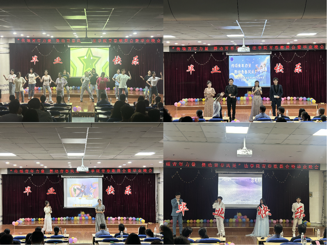 不忘记少年梦,也不曾忘记心中的那片星辰大海。在第三篇章,法学院宣讲团带来朗诵《我走在早晨的大路上》,用声音的抑扬顿挫将文字赋予情感细腻的表达,传递出积极向上的生活态度和对美好未来的无限憧憬;于佩玉演唱的歌曲《再不疯狂我们就老了》唱出了青春匆匆流逝的无奈与哀愁,引发了在场观众的强烈共鸣;法学院第七届学生会带来的部长舞为现场增添了欢快的氛围。最后,2019级学长学姐通过视频形式为2024届毕业生送去了最真挚的祝福,晚会在王皓晨等演唱的《星辰大海》中落下帷幕,在激昂的歌声中表达了对毕业生的美好祝福。
