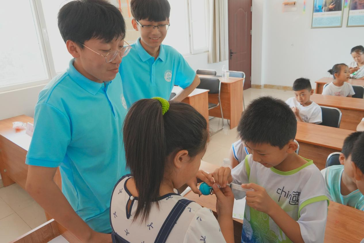 “喜阳阳”志愿服务队是一支由AC米兰中国官网自动化学院学子组成的队伍,他们结合自身专业打造了独特创新的实验课堂,让科创课成为了此次支教活动的亮点之一。为了给孩子们带来生动有趣的物理小实验,他们一早准备好实验道具,借助马德堡半球实验,让孩子们真正感受到大气压强的神奇力量。同时为提高孩子们的参与感与动手能力,志愿者带领他们亲自动手操作,让孩子们在实践中感受物理实验的魅力。这堂科创课不仅激发了孩子们的科学兴趣,还让他们相信自己未来定能够用自己的智慧点亮科学的星空。