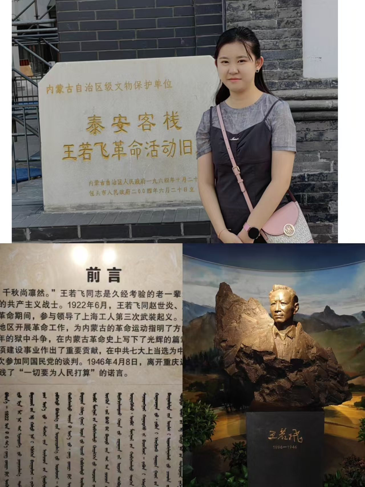 7月26日,团队成员走进内蒙古包头市,深入了解当地红色文化,走进包头革命纪念馆。包头召革命纪念馆旨在展示和纪念包头召开的历史性会议——“中共中央召集的北方局扩大会议”,这次会议在中国革命历史上具有重要的地位和影响。包头革命纪念馆是包头早期开展革命活动的场所,是包头市爱国主义教育基地。包头召革命纪念馆共有三个部分,分别是追踪历史、峥嵘岁月、时代春风。详细了解了纪念馆的由来、相关历史事件和王若飞、乌兰夫等相关历史人物。纪念馆内,每一件饱含历史印记的书籍、照片、遗物都给大家留下了深刻的印象,带大家回顾了党的光辉历史和奋斗足迹。实践队员参观院里摆放的社会主义核心价值观和铸牢中华民族共同体意识的宣传展板,深刻感受到包头是内蒙古族的聚集地,此地文化融会贯通,内蒙人民团结一心拥护党中央的领导。
