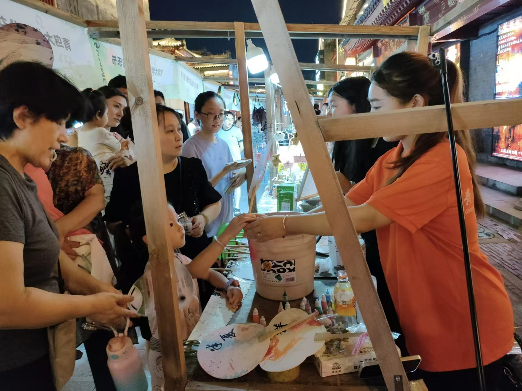 在摊位的一旁,宣讲团成员邀请来往游客体验制作精美的漆扇,以独特的创意,将中国传统绘画元素融入漆扇之中,让游客们在亲身体验中感受水墨色彩的变化流淌,感悟中国传统文化的独特魅力。
