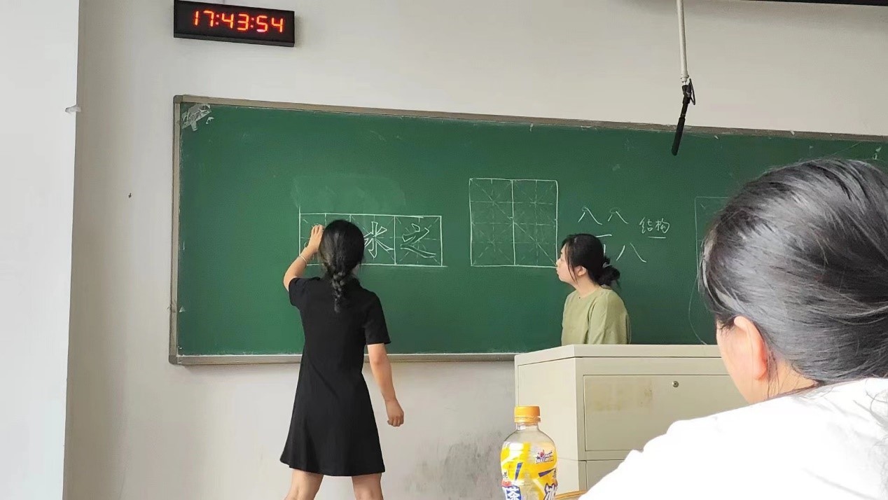 在书法体验环节中,队员们更是沉浸其中,纷纷表示:“书法社的学姐用‘之’和‘水’这两个简单的汉字带我们推开了书法结构的大门,让我们领略到了结构的风采。”一位队员兴奋地展示着自己的作品,脸上洋溢着满足的笑容。此外,实践队充分利用社交媒体平台,将书法教学的精彩瞬间和队员们的作品分享给更多人。“通过这次活动,我不仅学会了书法,更感受到了中华文化的魅力。”一位队员在个人社交媒体上写道,“希望更多人能了解并爱上这门艺术。”