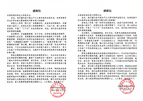 近日,化工学院团委“梦之光”志愿服务队和“语”你同行志愿服务队收到了来自共青团单县委员会的感谢信,信中对两支实践团队在单县北城街道四里埠村开展“三下乡”社会实践活动的突出表现予以表扬和感谢,对14名青年在单县北城街道党校开展支教活动、民情调研和助力乡村振兴所贡献的青春力量表示充分肯定。