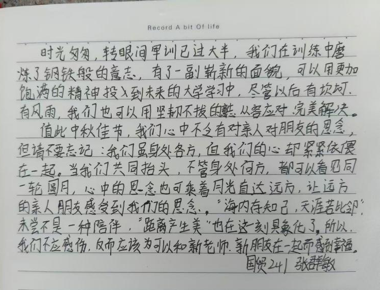学院团委举行“传文明 话中秋 汇文艺 颂党情”新生中秋团建活动,在操场设立中秋邮电箱,新生们以打电话、发短信或书信的方式,给远在他乡的亲朋好友传递思念、分享生活、送上祝福。组织新生拍摄与中秋有关照片,使用涂鸦笔、贴纸等功能进行绘制,形成自己的中秋打卡。此外,新生们在教室举行中秋爱国主义观影活动并书写感悟。