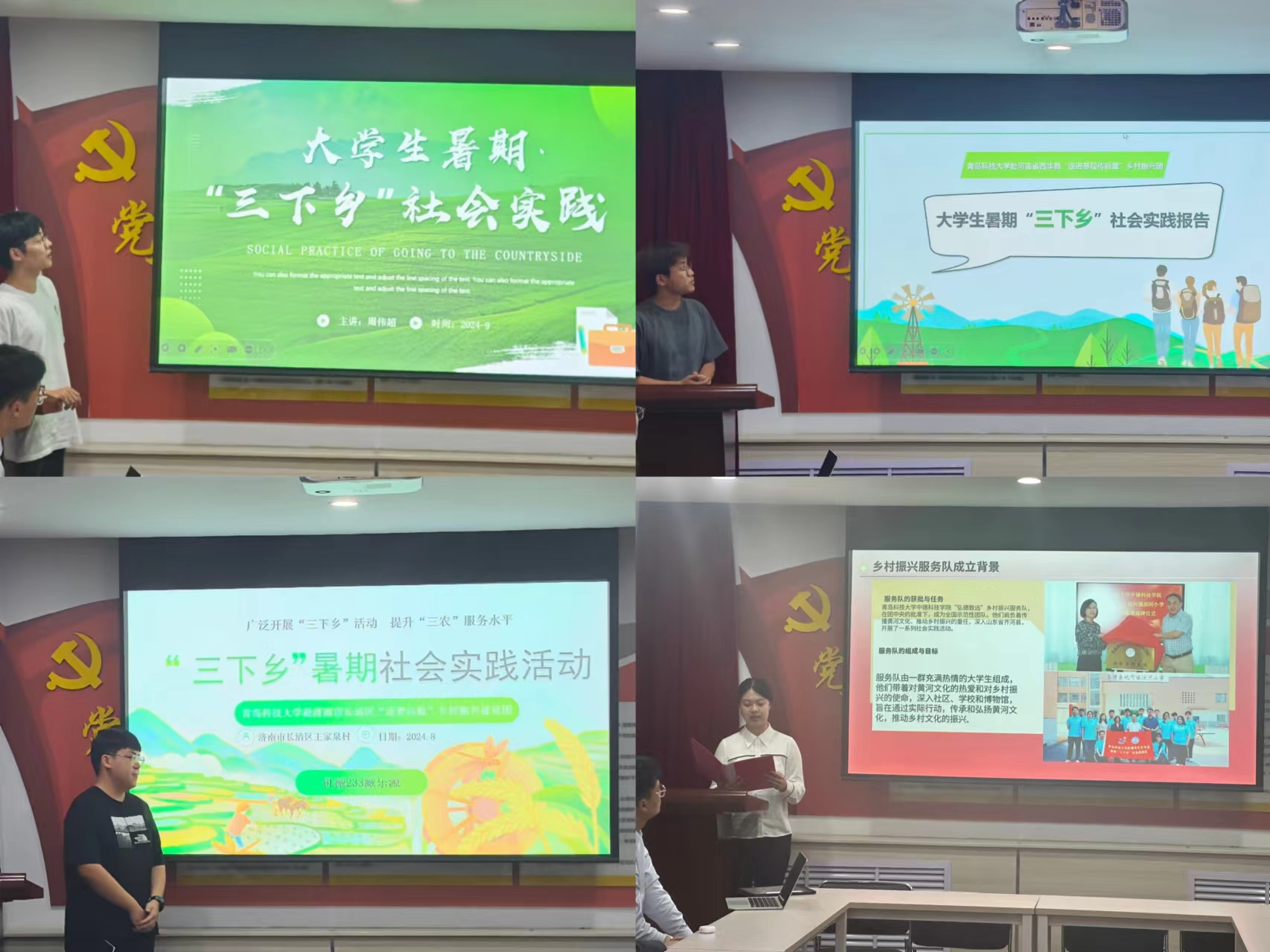 本次暑期社会实践活动,学院团委共组建了33支重点实践团队,其中团中央专项团队1支,校级重点队4支,院级重点队28支,207人积极投身“返家乡”社会实践活动,累计500余名青年学生奔赴省内外14地市,围绕理论宣讲、爱国主义教育、乡村振兴、非遗传承、基层服务等领域展开了形式多样、内涵深刻、卓有成效的社会实践活动。各实践队队长声情并茂地分享了实践过程中的所学所得、所思所感。他们或讲述着扣人心弦的故事,或描绘着刻骨铭心的感人瞬间,以其扎实的工作成果和质朴无华的语言,博得了在场同学们的阵阵热烈掌声。