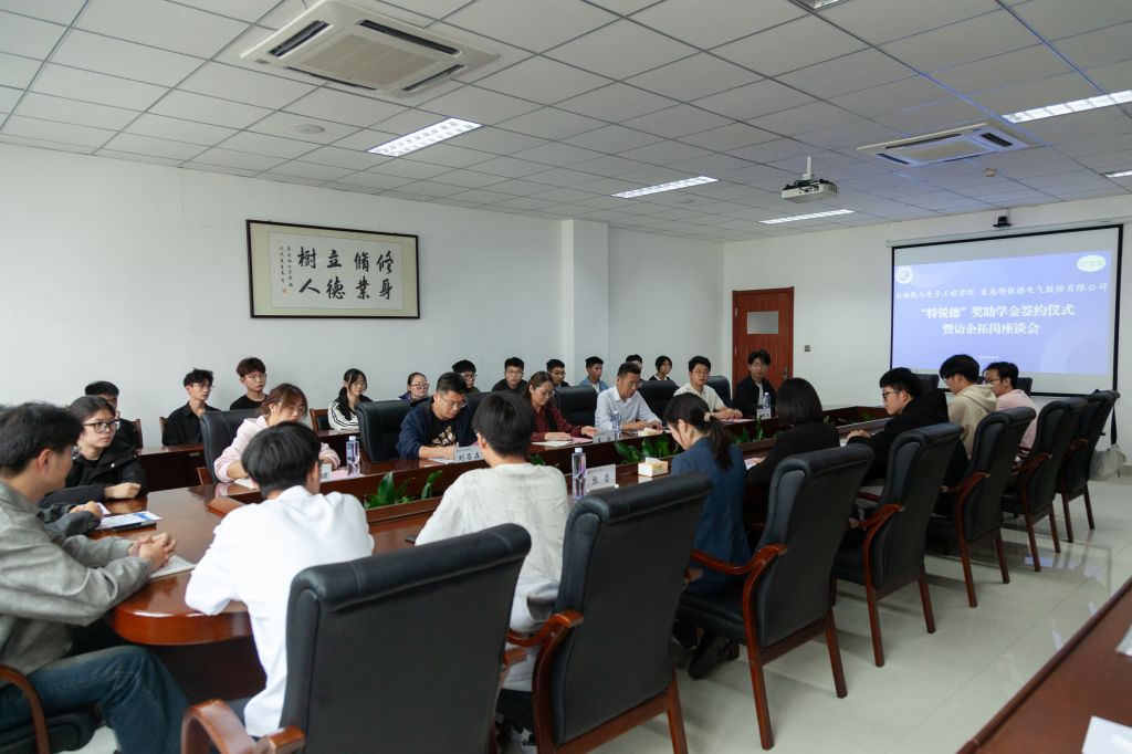为进一步深化校企合作,助力高层次人才培养,10月15日下午,自动化与电子工程学院团委与青岛特锐德电气股份有限公司于学院楼408会议室联合举办了“特锐德”奖助学金签约仪式暨访企拓岗座谈会。青岛特锐德电气股份有限公司人力资源中心总经理韩增雪、人力资源中心人力总经理助理张莹、学院党委书记李卉、学院常务副院长兼机器人学院常务副院长巩敦卫、学院党委副书记兼副院长刘名森出席会议,2025届毕业生辅导员老师张郁浩、赵赪赪,以及首届“特锐德”助学金获奖学生与2025届毕业生代表参加会议。会议由学院党委副书记兼副院长刘名森主持。