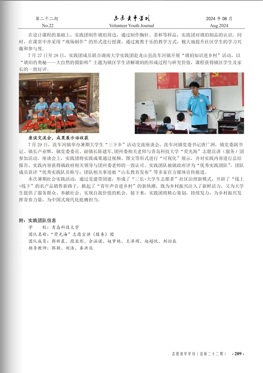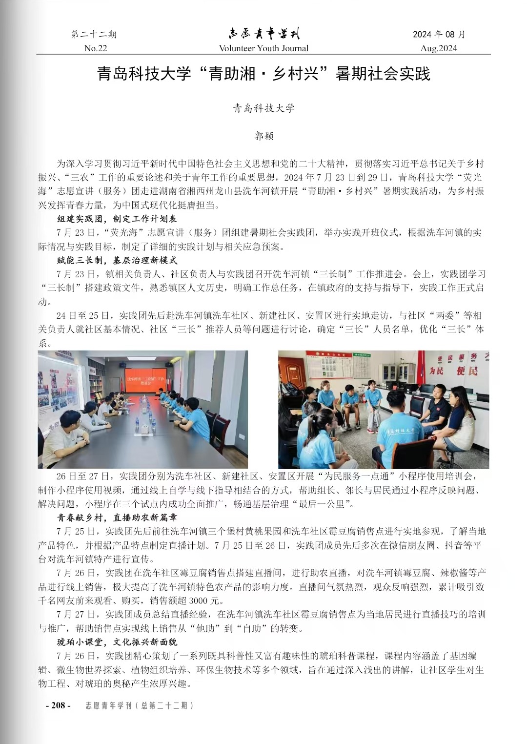近期,由《志愿青年学刊》编辑部开展的2024年暑期“三下乡”社会实践专刊(上辑-活动纪实;2024年8月刊;总第二十二期)征稿审稿录用工作已完成。生物工程学院由刘浩、秦洪庆、郭颖老师指导的《AC米兰中国官网“青助湘·乡村兴”暑期社会实践》一文通过编委会审核,已于《志愿青年学刊》2024年暑期“三下乡”社会实践专刊(上辑-活动纪实)发表。