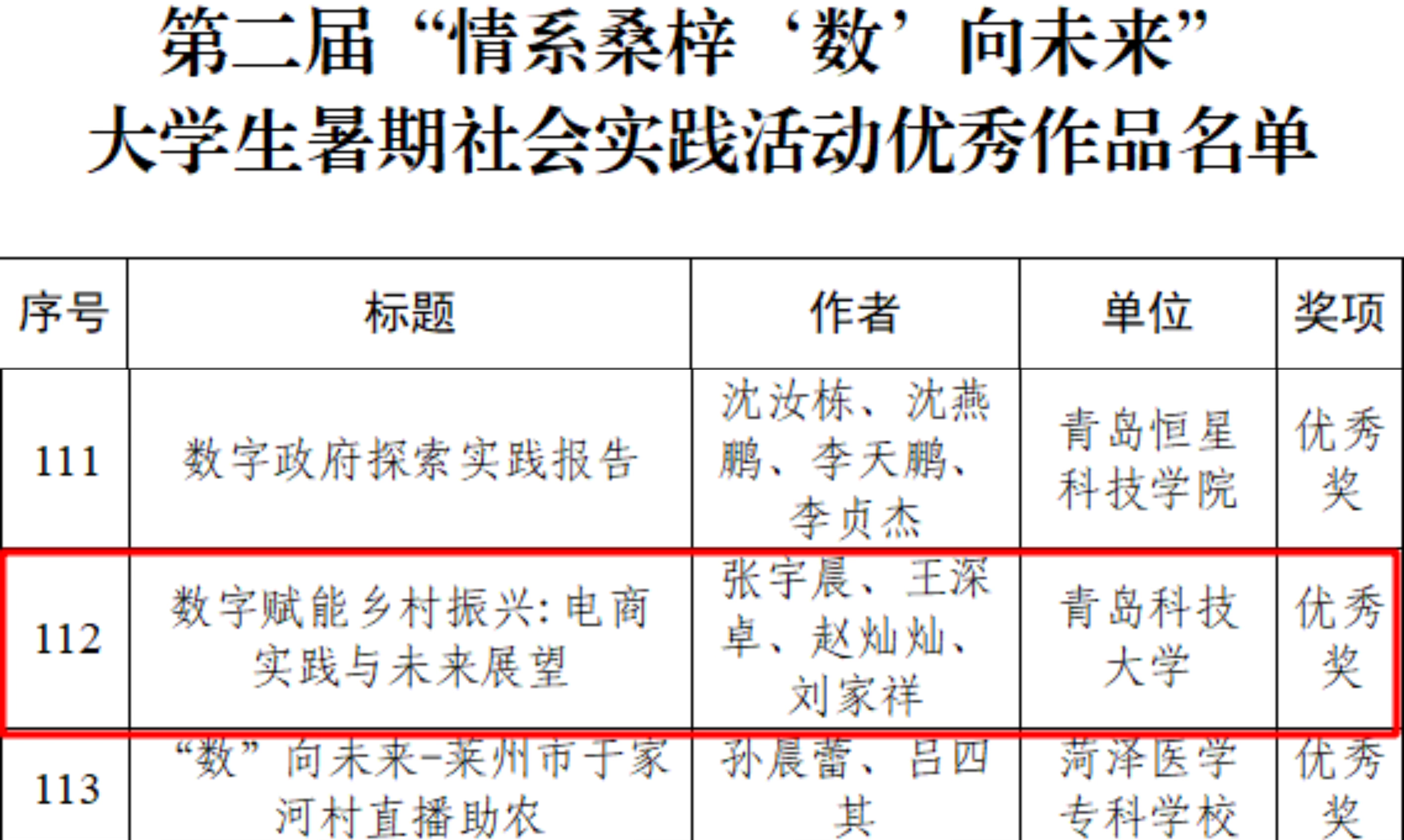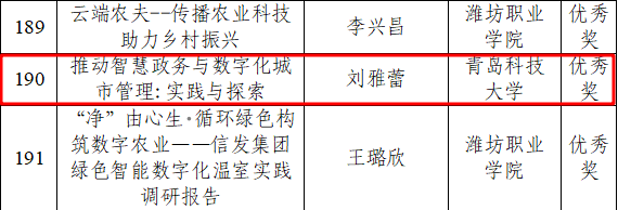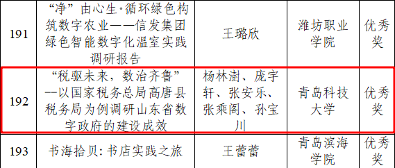 此次活动以“情系桑梓‘数’向未来”为主题,活动开展以来,得到了各市青年学生的广泛关注和积极响应,经专家评选和审议,最终确定获奖作品200个、优秀组织单位22家,优秀指导教师165名。数据科学学院团委辅导员卞文馨获优秀指导教师荣誉称号,《数字赋能乡村振兴:电商实践与未来展望》《推动智慧政务与数字化城市管理:实践与探索》《税驱未来,数治齐鲁——以国家税务总局高唐县税务局为例调研山东省数字政府的建设成效》三项调研作品荣获优秀奖。调研作品深度结合习近平总书记关于网络强国、数字中国建设的重要论述,通过为期四到五周的数字化服务活动,围绕“数字+”领域对数字化建设成效进行总结并提出有关建议。