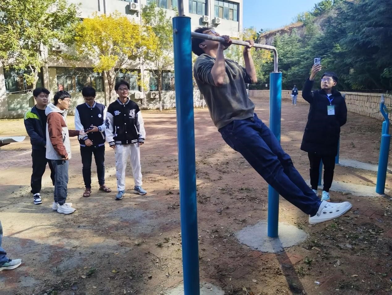 比赛开始前,参赛选手组队来到指定赛场进行热身并有序签到。哨响后,仰卧起坐的女队员们快速起卧,争分夺秒,动作流畅。在引体向上的比赛现场,参赛同学稳抓单杠,手臂带动身体,奋力撑过横杠,呼吸从平稳到急促,双臂从放松到紧绷,每个动作都充满了力量与坚持。