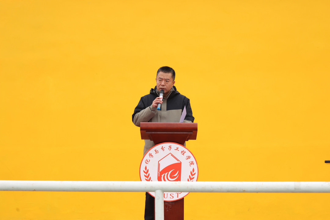 化学院副院长刘尧致开幕词,他先向全体师生的出席表示最热烈的欢迎和感谢,其次,强调了体育活动对于大学生的重要性。他希望青年学生能够发扬“科大精神”、践行“橡胶品格”、贯彻“五有理念”,通过体育强健自身体魄,实现以体育智、以体育心、以体育人,从而为中国的发展贡献力量。最后,他对所有的参与者表达了最衷心的祝愿,并对开幕式的圆满举行表示了最热烈的祝贺。