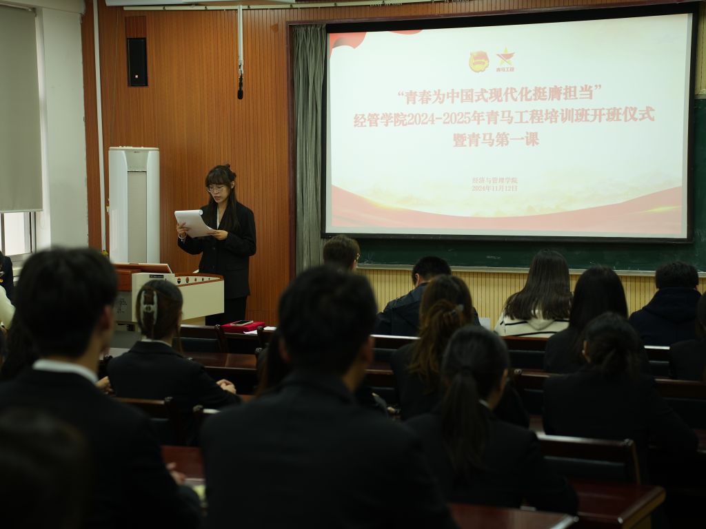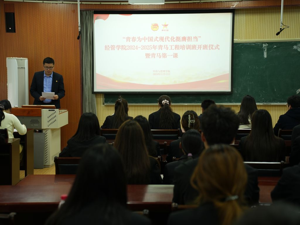 为深入贯彻落实习近平新时代中国特色社会主义思想和党的二十届三中全会精神,进一步深化学习“青年马克思主义者培养工程”关于青年工作的重要论述,激励广大团员青年坚定马克思主义信仰,争做新时代青年马克思主义者,不断培养学生骨干、共青团干部的爱党爱国情怀,塑造一批素质高、能力强、肯干事的团学骨干队伍。经管学院积极响应团委号召,于11月12日下午在经管楼419会议室举行“青春为中国式现代化挺膺担当”2024—2025年青马工程培训班开班仪式暨青马第一课。学院党委副书记兼副院长牛宝卫、各年级辅导员老师、青马培训班学员和部分学生代表参加开班仪式。开班仪式由团委书记付继航主持。