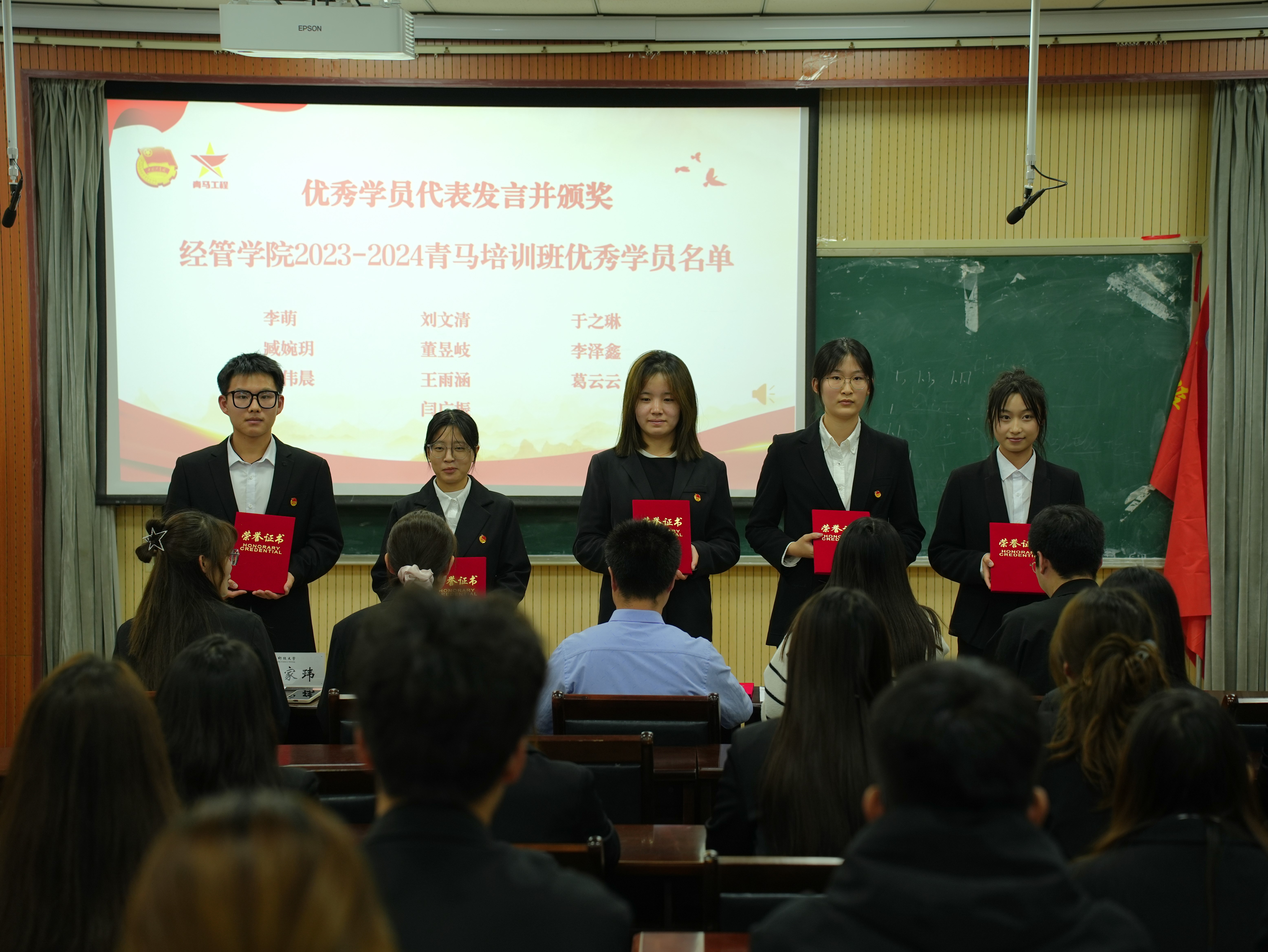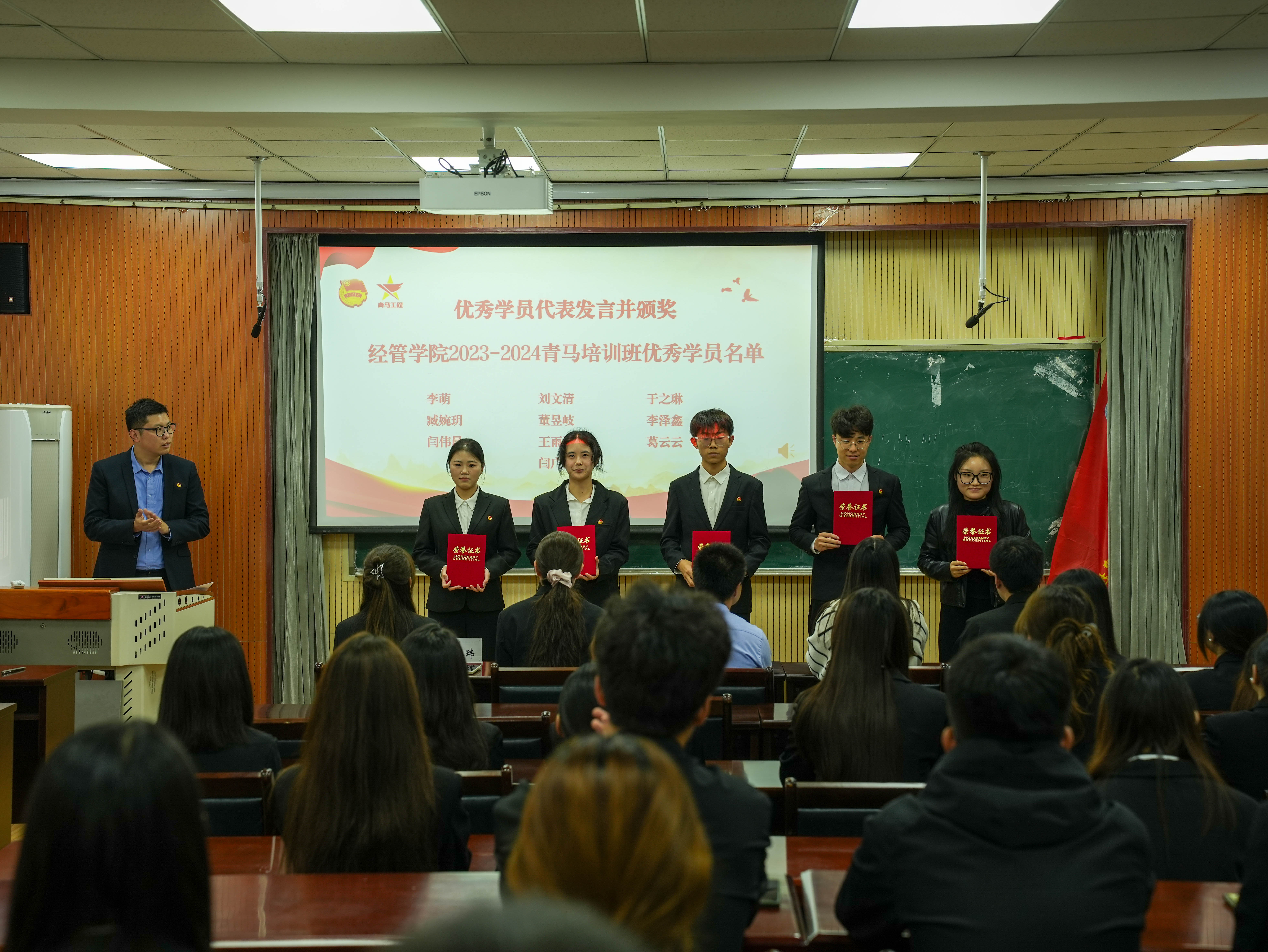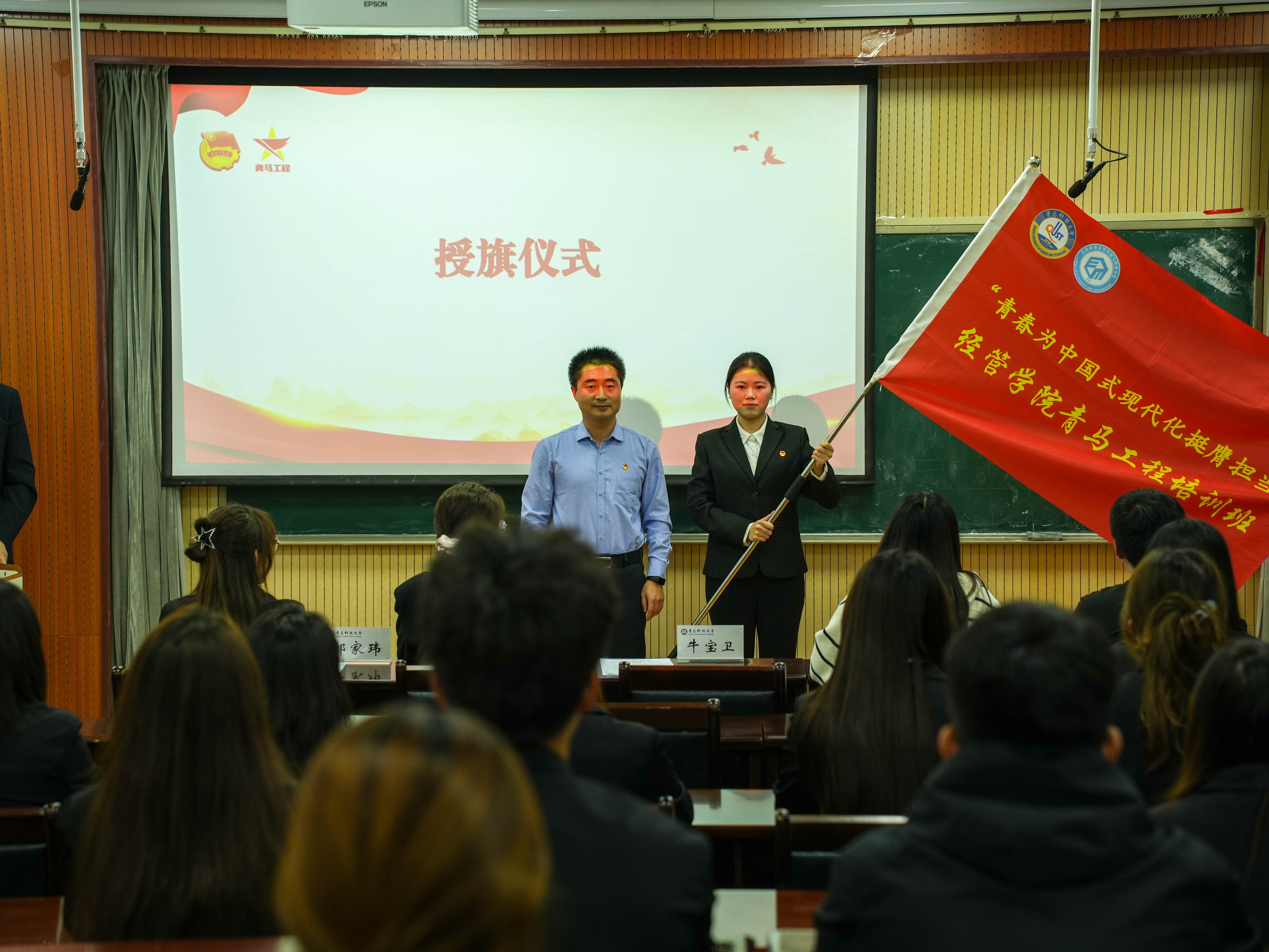 往届优秀学员代表李萌做分享发言,她表示作为新时代青马班学员及大学生骨干,要珍惜此次培训机会,努力从自身做起,筑牢思想根基,自觉用马克思主义中国化的最新理论成果武装头脑,在强国建设、民族复兴的时代征程上接续奋斗。培训班学员代表王雨涵做表态发言,她表示作为青马学员,要积极响应团委号召,要做眼中有光、脚下有路、肩上有责的新青年,以坚定的理想信念投身到国家建设的伟大事业中去,践行青年马克思主义者的使命担当。牛宝卫和辅导员老师为2023—2024年青马优秀学员颁发证书,牛宝卫为2024—2025年青马培训班授旗。