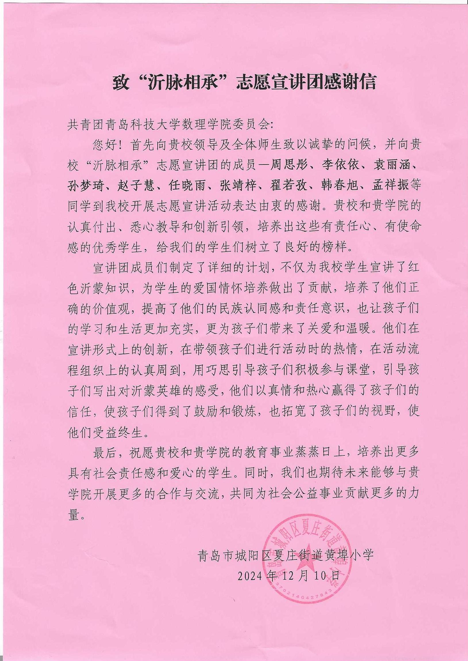 为了更好地传承红色基因,弘扬沂蒙精神。近日,全国大学生沂蒙精神宣讲团、数理学院统计241班与应数241班“沂脉相承”志愿宣讲团走进青岛市城阳区黄埠小学,开展沂蒙精神志愿宣讲活动。