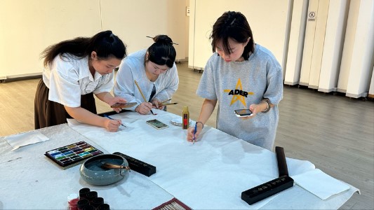 活动现场气氛热烈,色彩斑斓的颜料与充满创意的画笔交相辉映。艺院学子全情投入,每个人都以饱满的热情在长卷上挥洒着自己的灵感。他们用熟练的笔触勾勒出心中的祖国山河,那鲜艳的牡丹、雄伟的长城、壮丽的校门,无不展现着他们的爱国情。